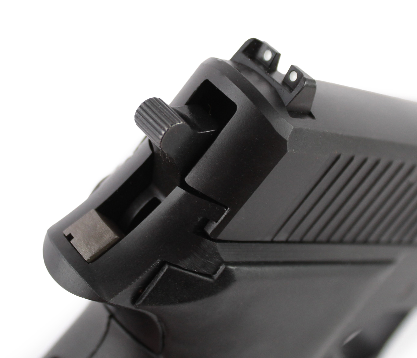 Неавтоматический предохранитель отсутствует, безопасность при обращении с пистолетом обеспечивается блокировкой ударника. Выстрел невозможен, пока не нажат спусковой крючок. Оружие безопасно и удобно в обращении.