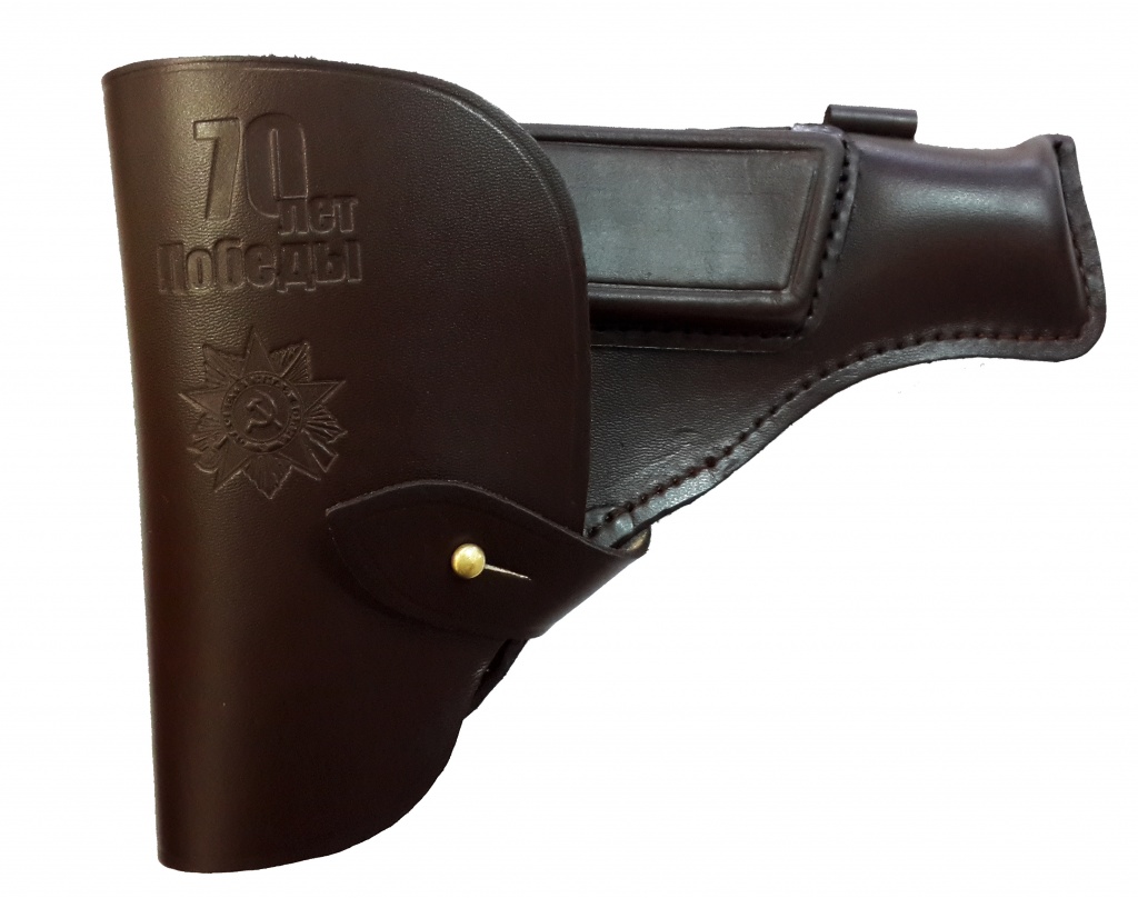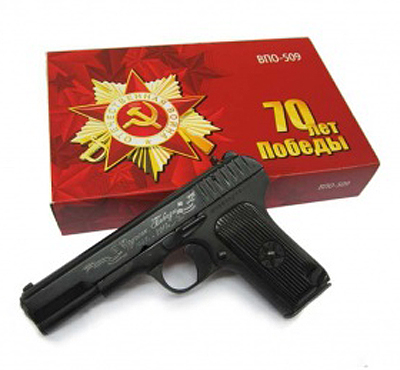 Специальный юбилейный вариант известного бесствольного пистолета посвящен, как нетрудно догадаться, 70-летию победы в ВОВ. От стандартной модели отличается праздничной гравировкой и тиснением на кобуре.