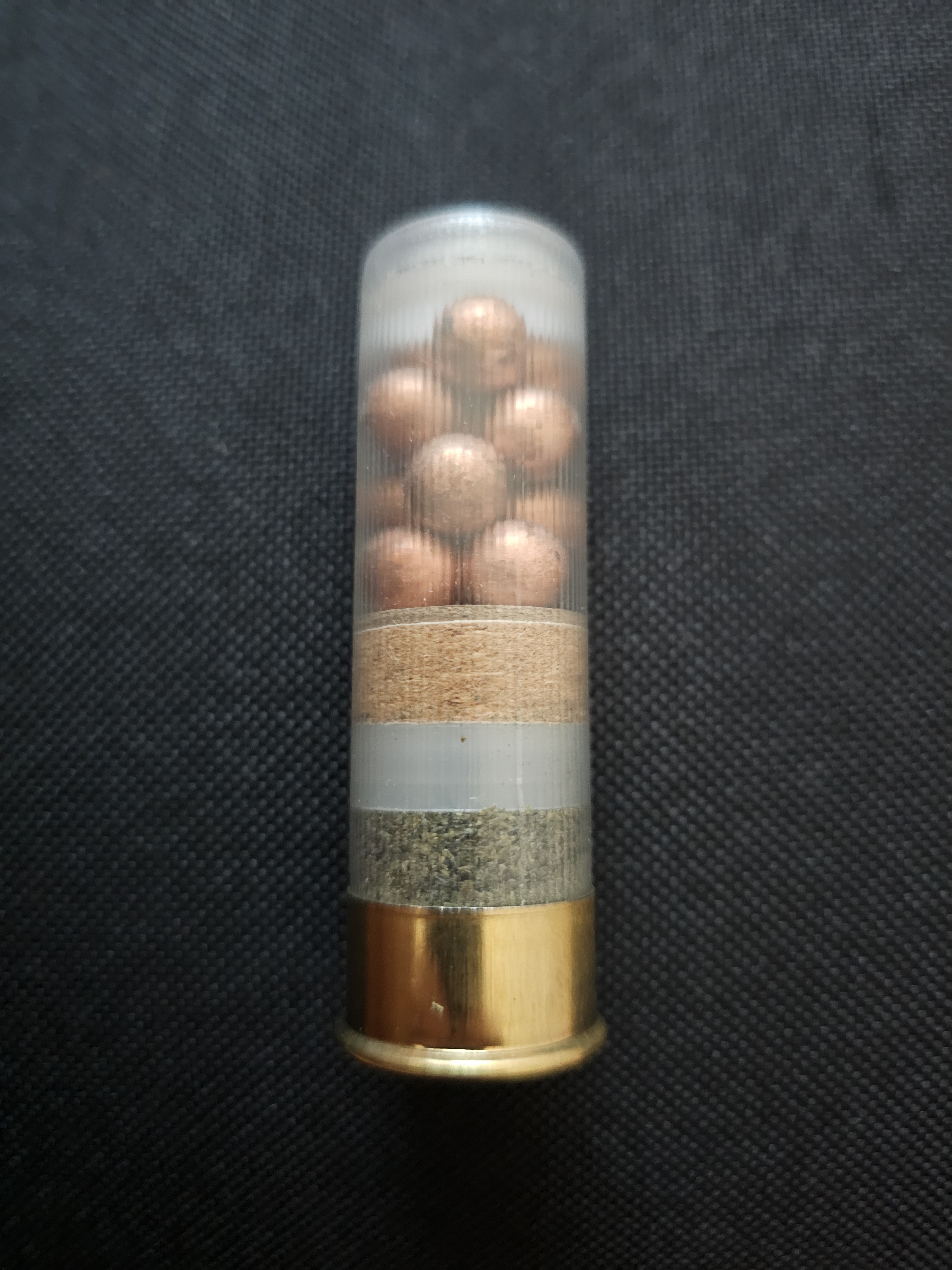 Патроны бесконтейнерного снаряжения с использованием осаленных древесно-волокнистых пыжей и омедненной картечи.