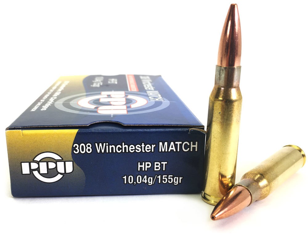 Патрон PPU калибра 308Win Match с пулей HP BT весом 10,04г. Тип пули - HP BT (hollow point boat tail) в дословном переводе «пустой нос с хвостовым сужением». Свойства пули: сильная деформация, умеренная проникающая способность.
