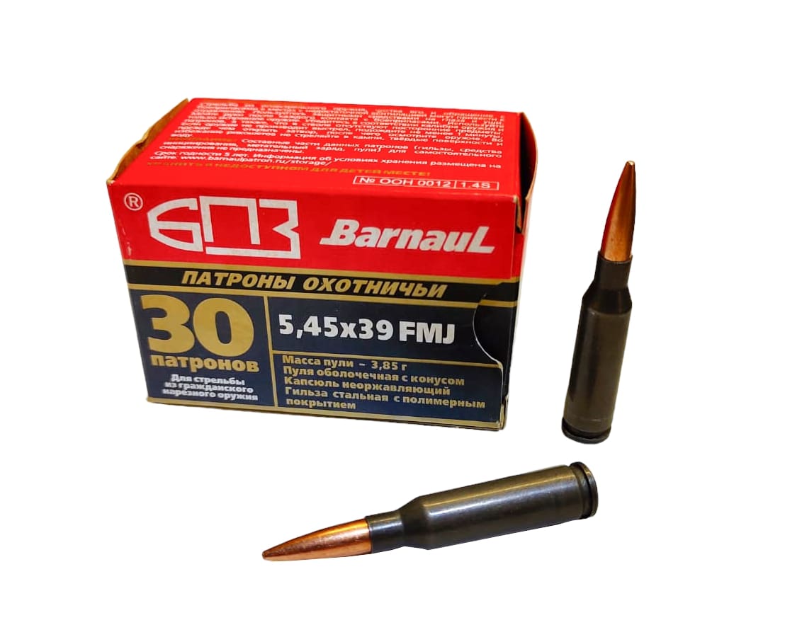 Патрон 5,45х39 БПЗ FMJ – это патрон, предназначенный для стрельбы из охотничьего и спортивного нарезного оружия. Он отлично подойдет для охоты на среднего зверя, на дистанции до 300 м. FMJ Full Metal JacketFull Metal Jacket Full Metal Jacket - пуля с цельной оболочкой из меди, или медного сплава. Оболочка помогает лучше держать нарезы, что положительно влияет на баллистику. Так же пуля с оболочкой имеет большую проникающую способность.Подробнее – это пуля с цельнометаллической оболочкой. Она состоит из оболочки, изготовленной из мягкого металла (это может быть мельхиор, томпак, биметалл) и свинцового сердечника. FMJ имеет классический профиль: оживальную, ведущую и хвостовую часть. Пуля обладает хорошими баллистическими характеристиками и высокой пробивной силой. Она почти не деформируется при попадании в ткани и имеет достаточное останавливающее действие.