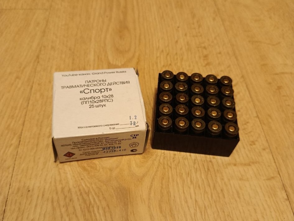 В травматическом боеприпасе калибр измеряется как по диаметру шарика (например, 10x22Т), так и по диаметру гильзы (9 РА). В зависимости от длины гильзы изменяются характеристики и назначение патрона. Обозначение калибра 10x22Т будет расшифровано как - калибр 10 мм, с длиной гильзы 23 мм, буква Т обозначает травматический. Обозначение 9 РА – расшифровывается как – калибр 9 мм, РА (Pistole Ammunition). Подробнее | 10x28 T | ||