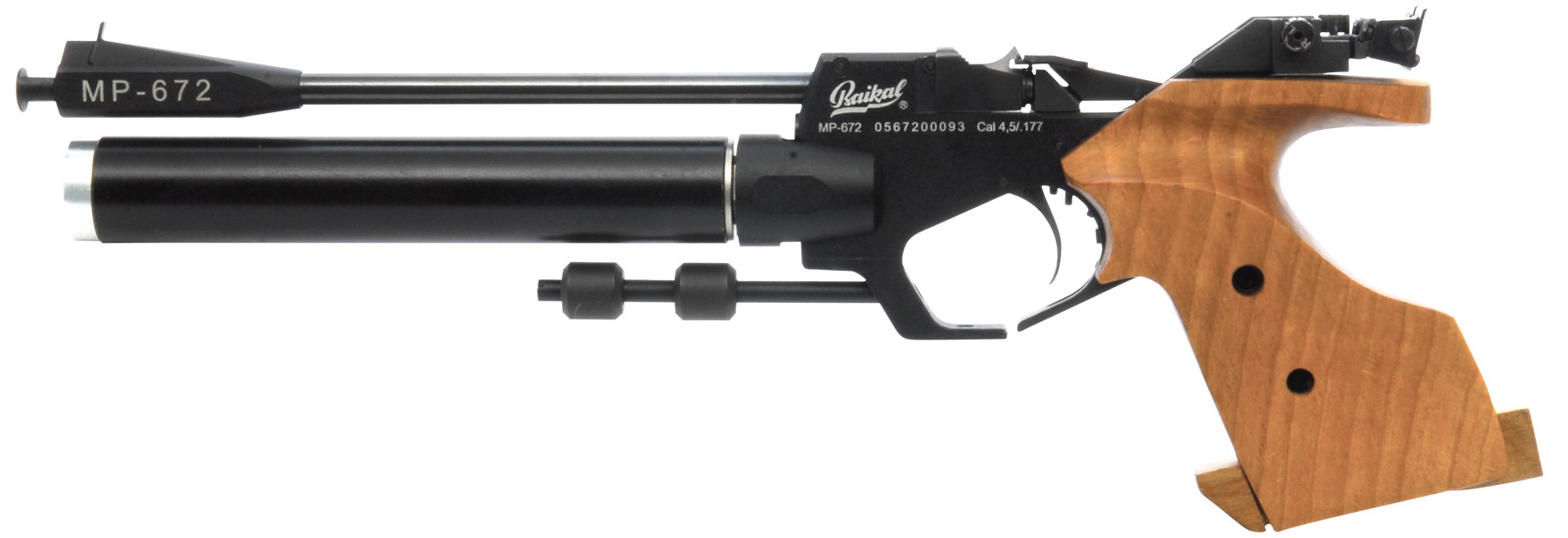 Разработан на базе известного стандартного пневматического пистолета МР–46. Пневмобаллонная схема обеспечивает большее удобство при стрельбе, чем компрессионная, не снижая характеристик кучности. Пистолет МР-672 по своим конструктивным и габаритным характеристикам удовлетворяют требованиям правил соревнований по стрельбе в классе «Стандартный пневматический пистолет».