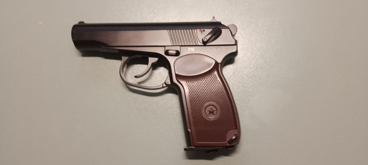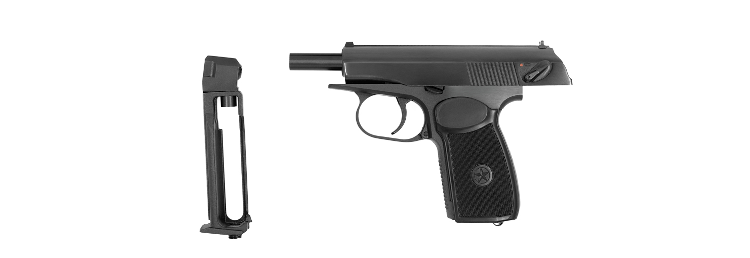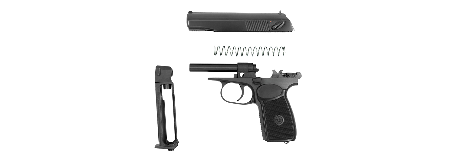 Пневматический пистолет выполнен на основе боевого пистолета Макарова ПМ и максимально точно копирует оригинал по внешнему виду, материалам, весу, размерам, процессу разборки и подготовки к стрельбе. Для стрельбы используются металлические шарики диаметром 4,5 мм.