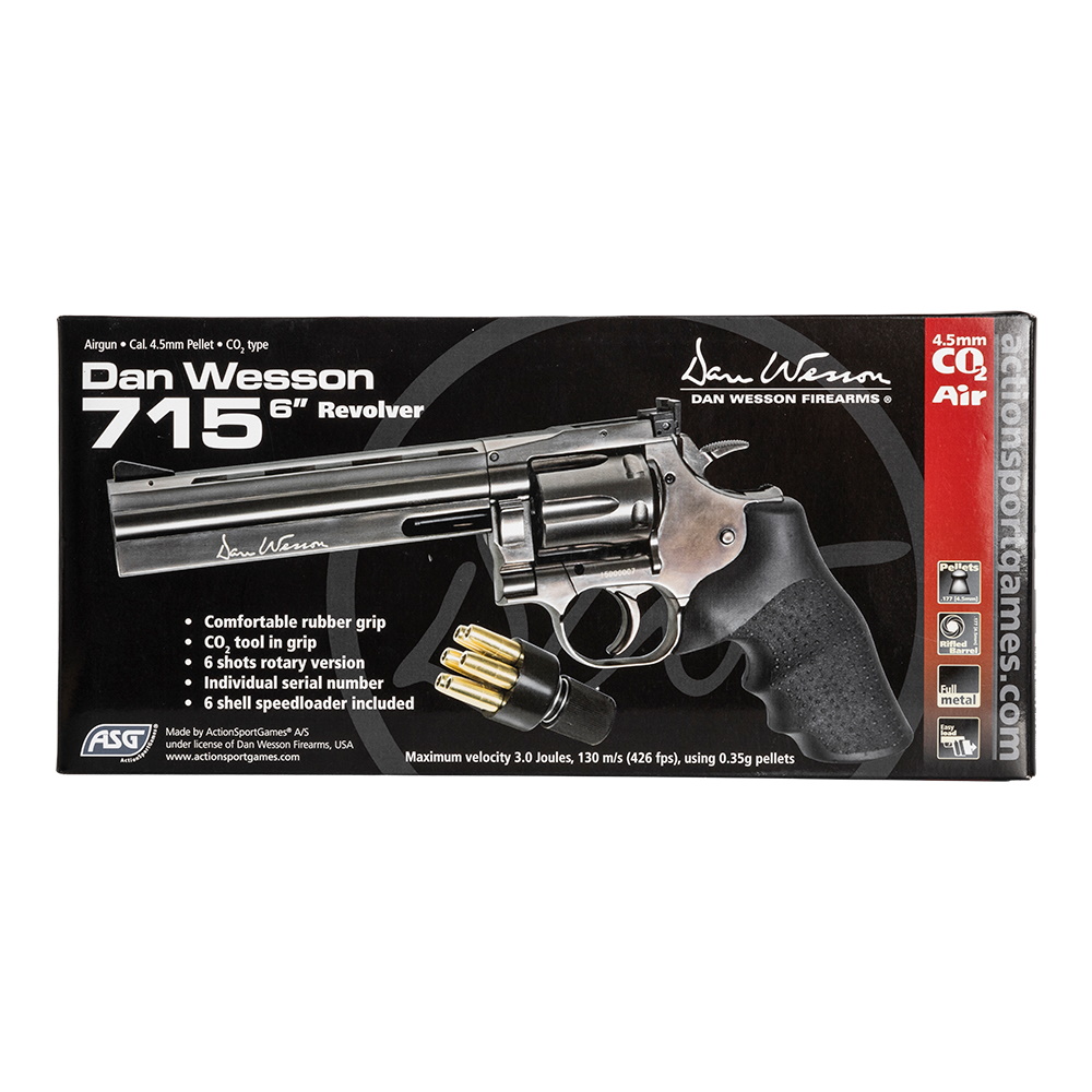 Пневматический пистолет ASG Dan Wesson 715 является примером газобаллонной пневматики с дульной энергией до 3 Дж. В такого рода пневматике выстрел производится за счет энергии сжатого углекислого газа, содержащегося в специальных баллончиках СО2. Прототипом данной модели пневматического револьвера является Dan Wesson.