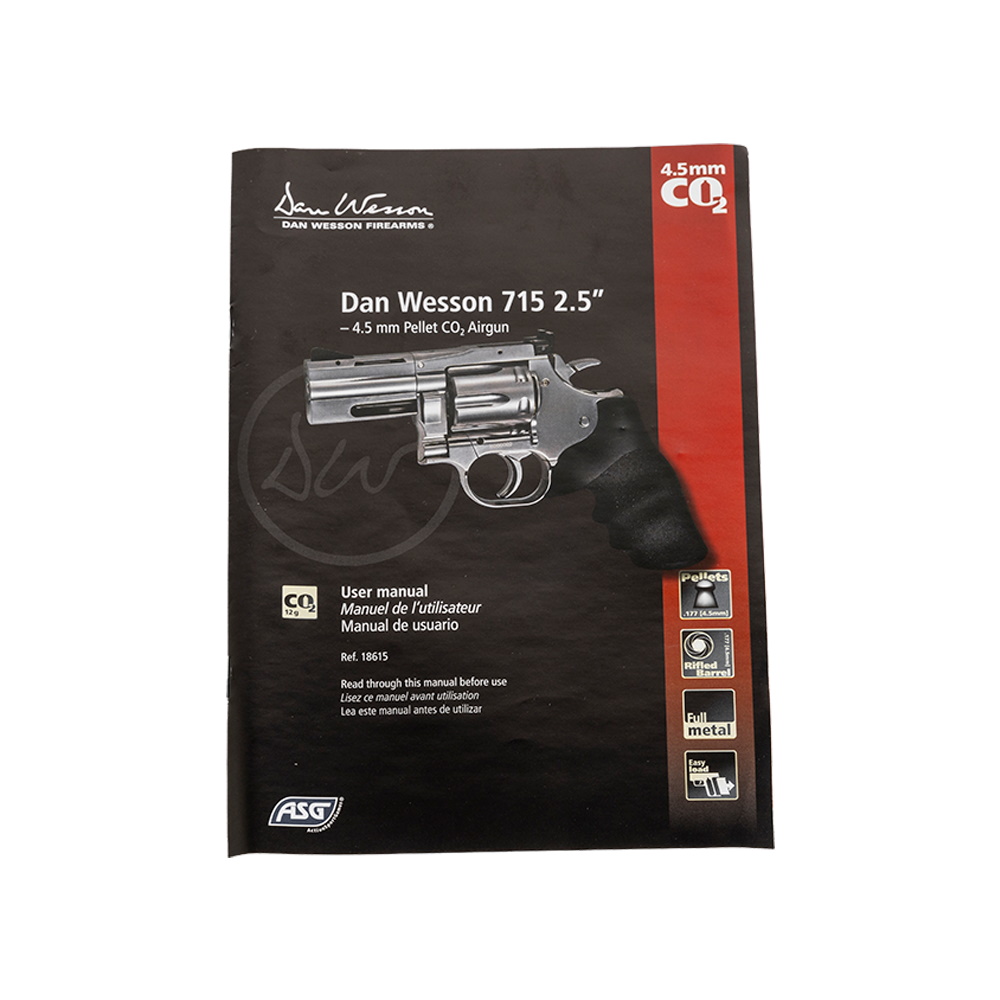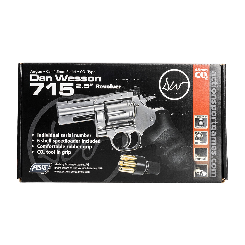 ASG Dan Wesson 715 обладает достойным рядом технических и стрелковых показателей. Магазин-барабан пневмата вмещает в себя 6 пуль калибра 4,5 мм. Для заряжания используется 6 фальшпатронов. Для стрельбы необходимо использовать легкие пули, весом 0.2-0.4 гр. Пистолет изготовлен из металла, что придает ему высокую прочность.
