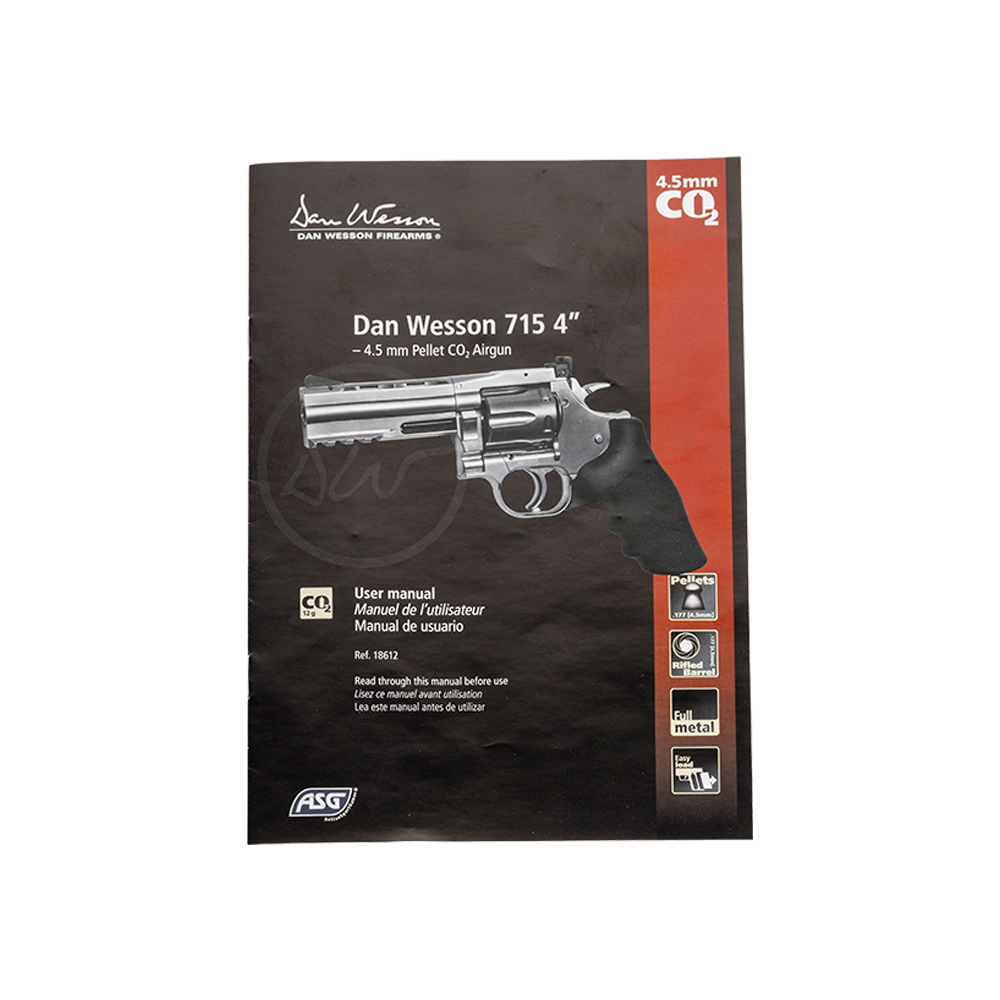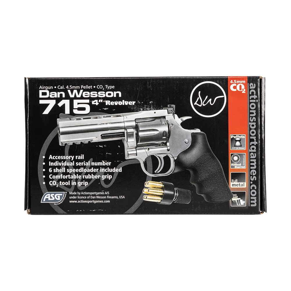 ASG Dan Wesson 715 обладает достойным рядом технических и стрелковых показателей. Магазин-барабан пневмата вмещает в себя 6 пуль калибра 4,5 мм. Для заряжания используется 6 фальшпатронов. Для стрельбы необходимо использовать легкие пули, весом 0.2-0.4 гр. Пистолет изготовлен из металла, что придает ему высокую прочность.