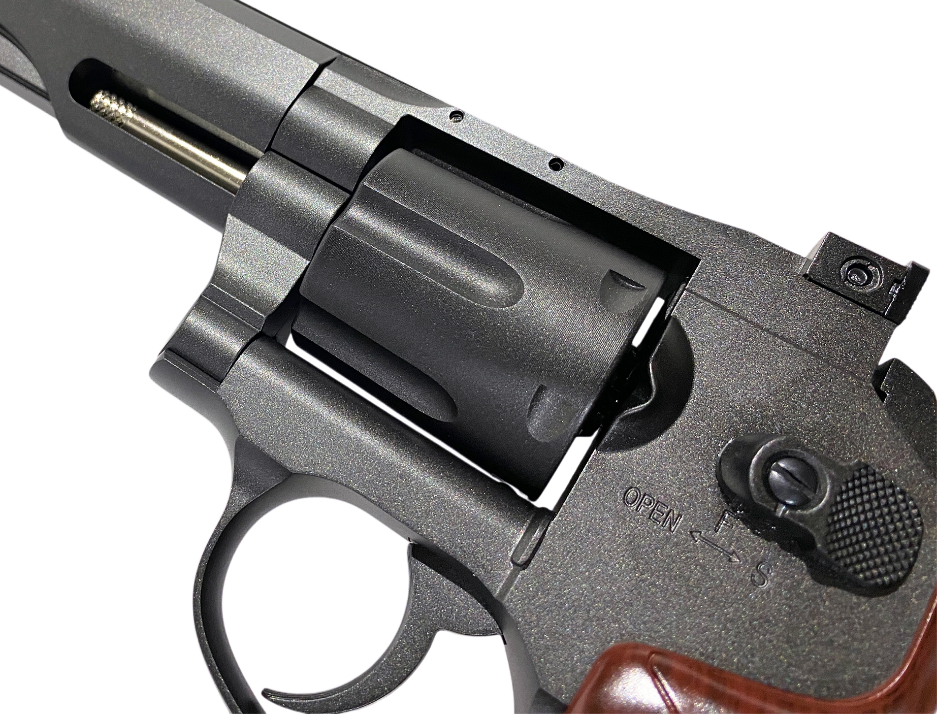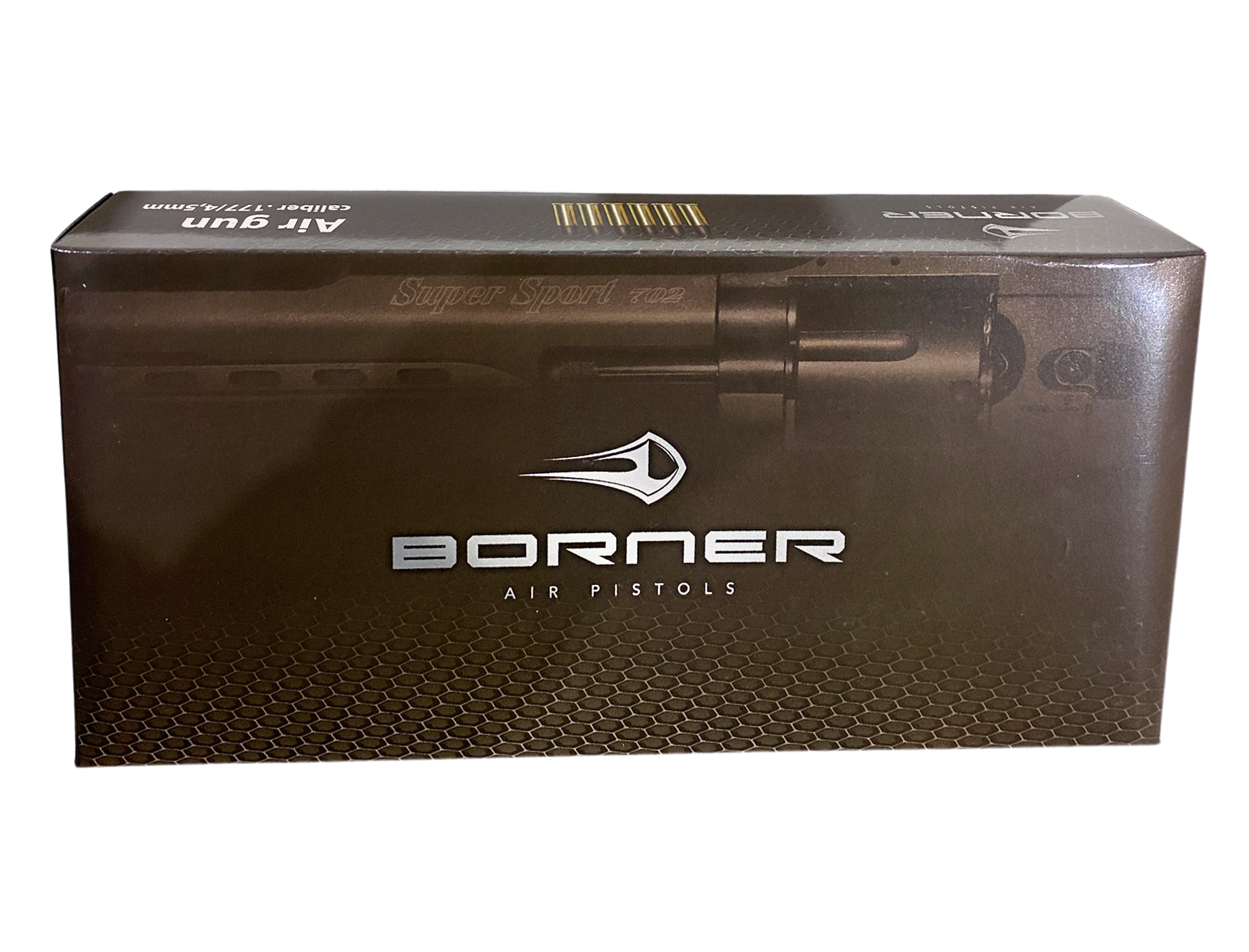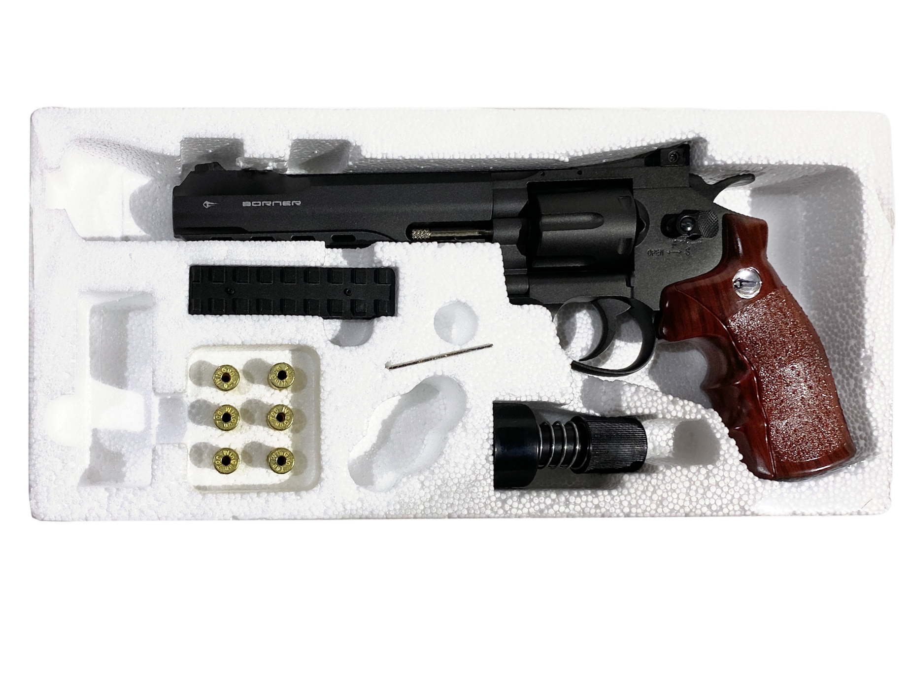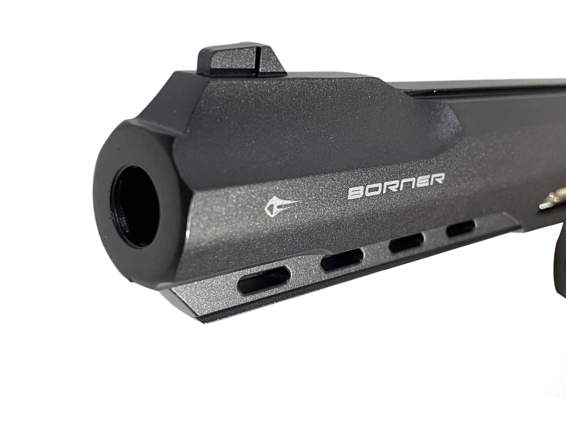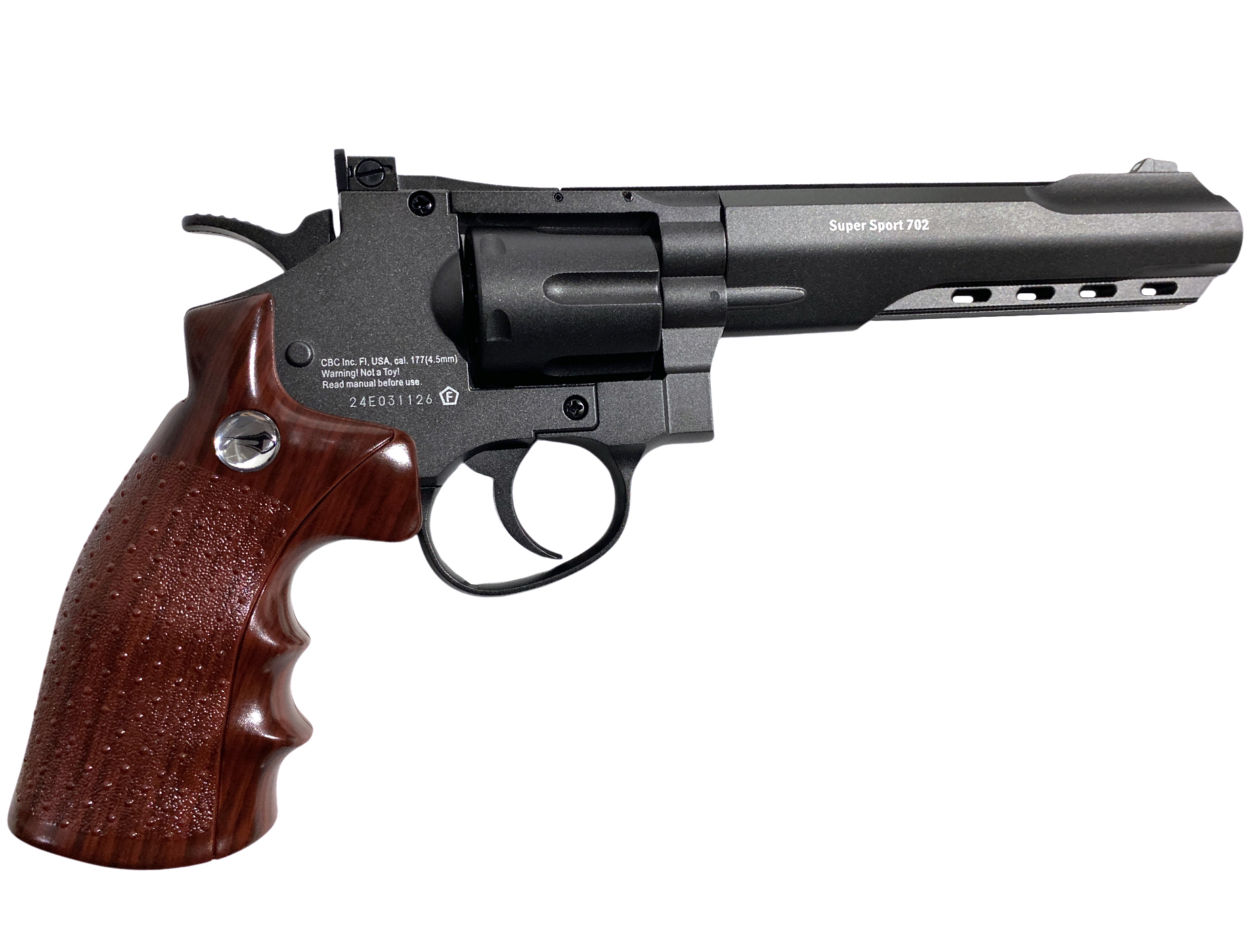 BornerSuperSport 702- эффектный и качественный пневматический револьвер с шикарным и узнаваемым дизайном. Пистолет выполнен из металлического сплава, накладки на рукояти - пластик, имитирующий дерево. Благодаря длинному стволу обладает хорошей точностью и высокой начальной скоростью полета пули. С