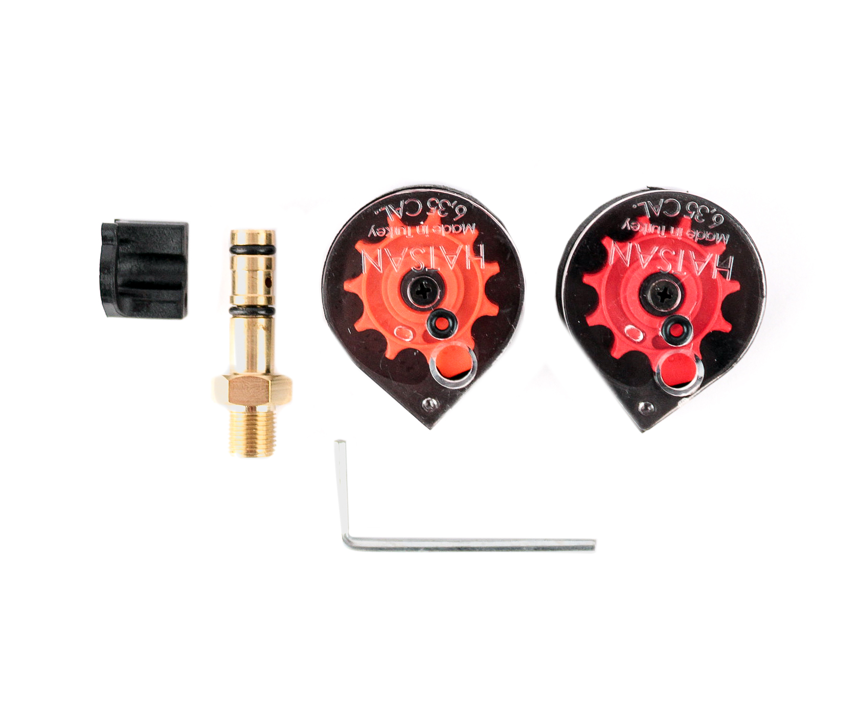Ствол нарезной, рассчитан на стрельбу пулями 6,35 мм для пневматики. Магазин барабанного типа, вмещает 10 пулек.