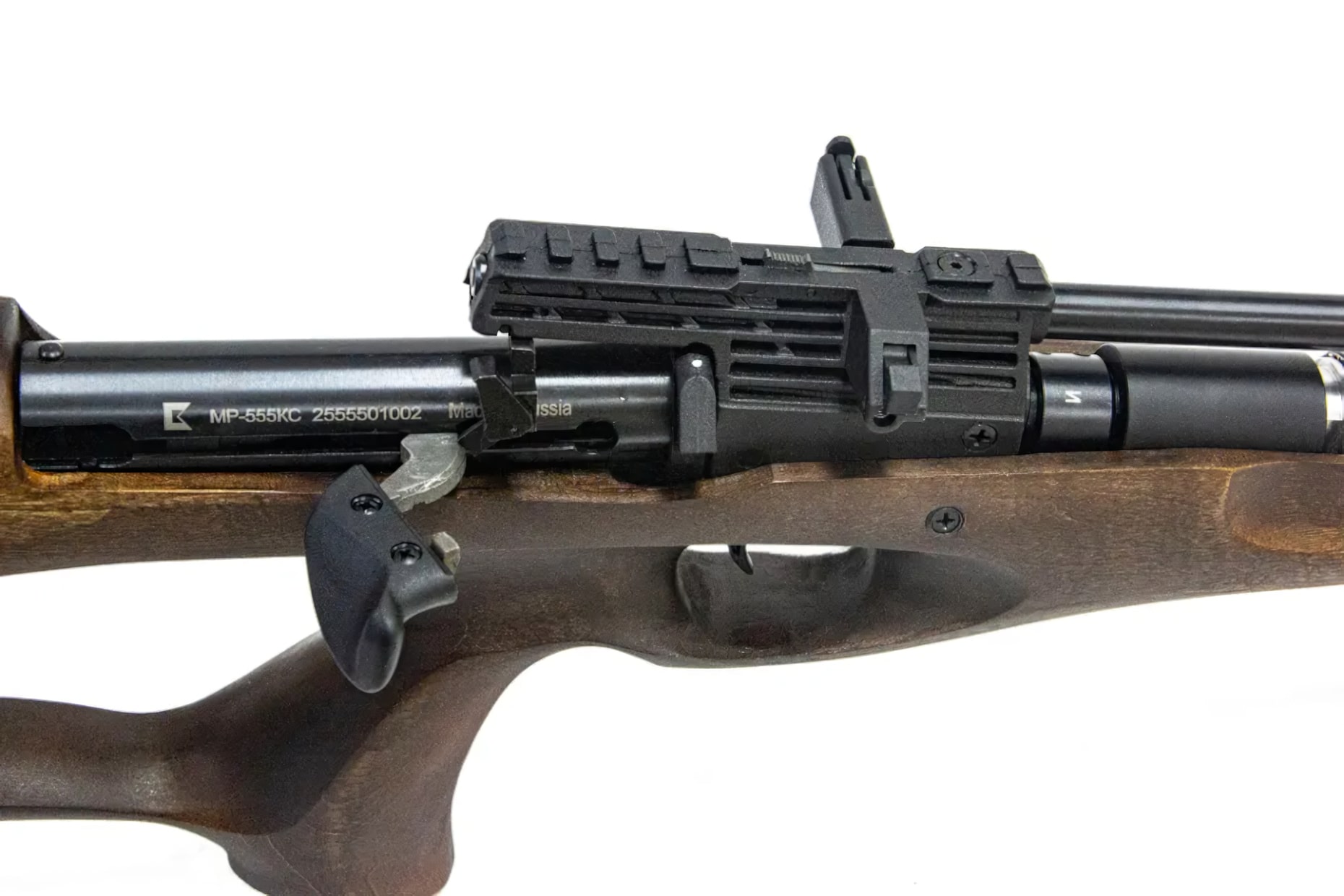 Пневматическая винтовка МР-555КС-04 с предварительной накачкой воздушного баллона высокого давления создана на базе винтовки МР-61 и отличается от нее принципом действия ( РСРРСР — пневматическая винтовка с расположенным под стволом или в прикладе резервуаром для воздуха или другого газа. Давление в баллоне около 200 атм. Бывают варианты с большим предельным давлением, около 300 атм. Воздух в резервуар нагнетается при помощи насоса высокого давления или с помощью предварительно заправленного баллона. Также в качестве рабочего тела может применяться гелий, из-за его лучшей сжимаемости и большей скорости звука в нём.Подробнее ) и улучшенной эргономикой.