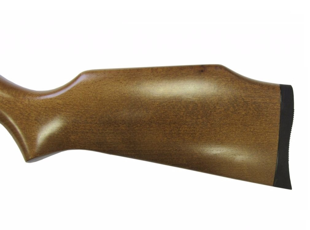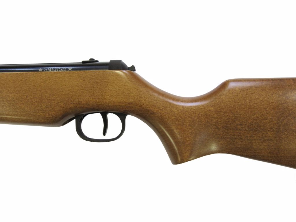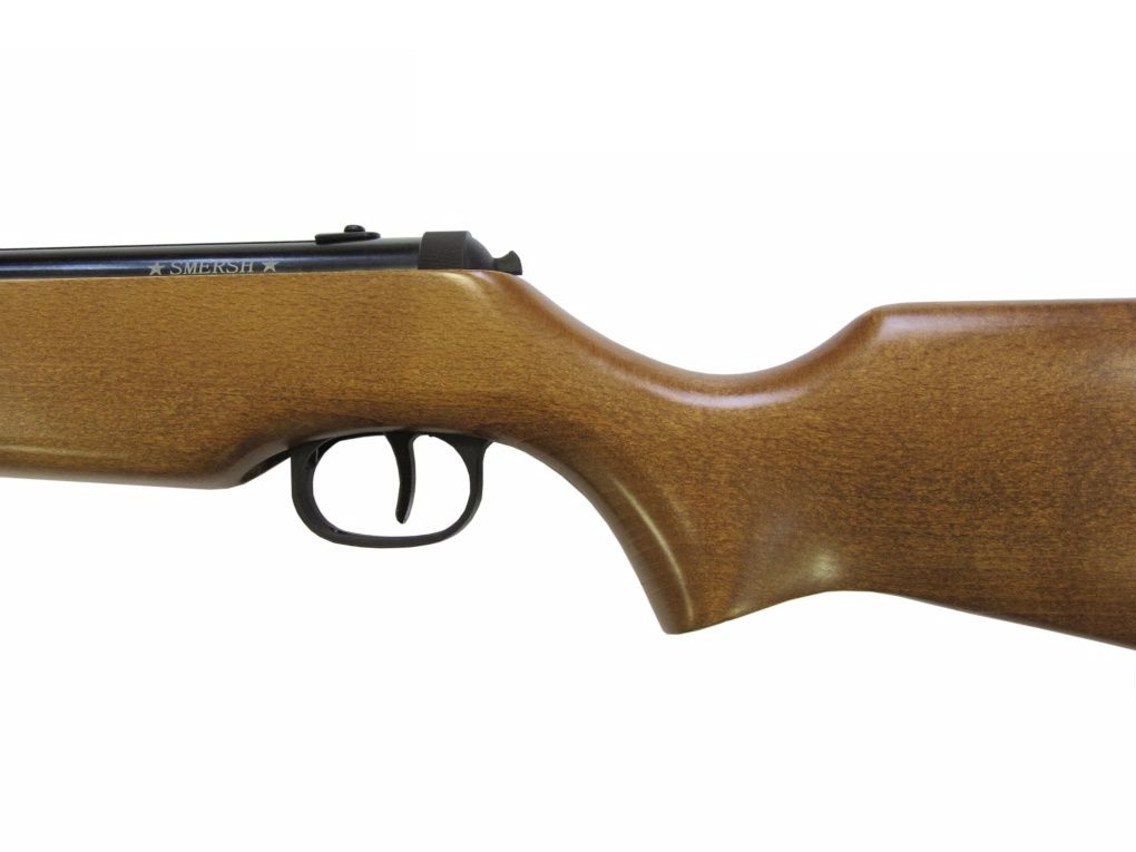 Винтовка Smersh R7 - аналог знаменитой пружинно поршневой винтовки Diana 350. Взвод осуществляется переломом ствола. Производитель заявляет начальную скорость пули 168м/с на ослабленной пружине. В комплекте поставляется усиленная пружина. Установка газовой пружины невозможна, т.к. поршень имеет центральный зацеп. Ложа винтовки Smersh R7 изготовлена из бука. Затыльник приклада сделан из резины, хорошо поглощает отдачу. Ствол нарезной, стальной. Запирание ствола осуществляется на ригель - классическая диановская схема, герметичность узла достигается за счет резиновой шайбы-уплотнителя. Ствол посажен в стальную муфту. Винтовка имеет мягкий и предсказуемый спуск. Прицельные устройства открытого типа. Винтовка станет отличным выбором для охотников на мелкую дичь и любителей плинкинга.