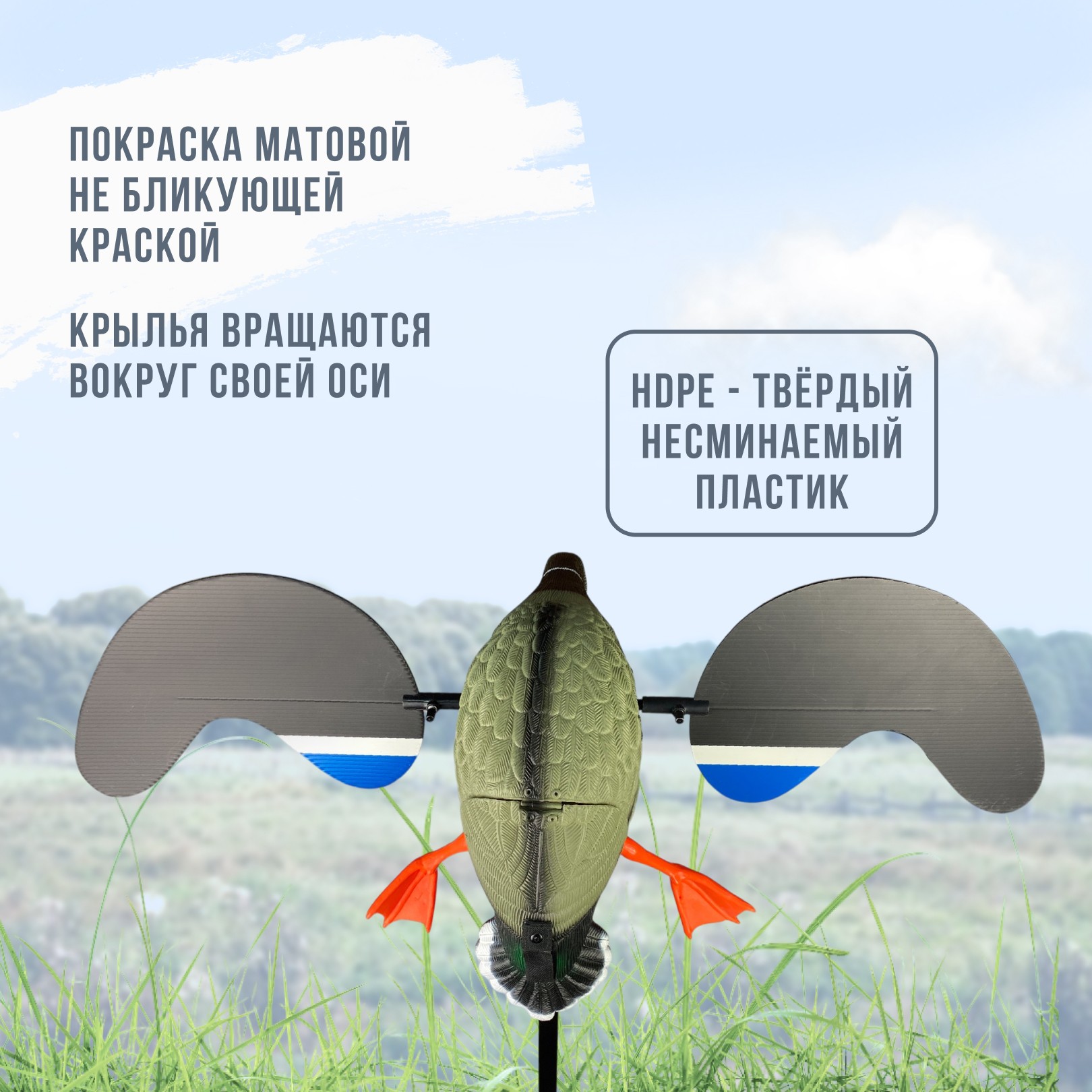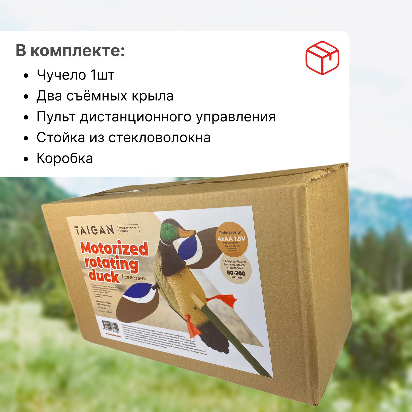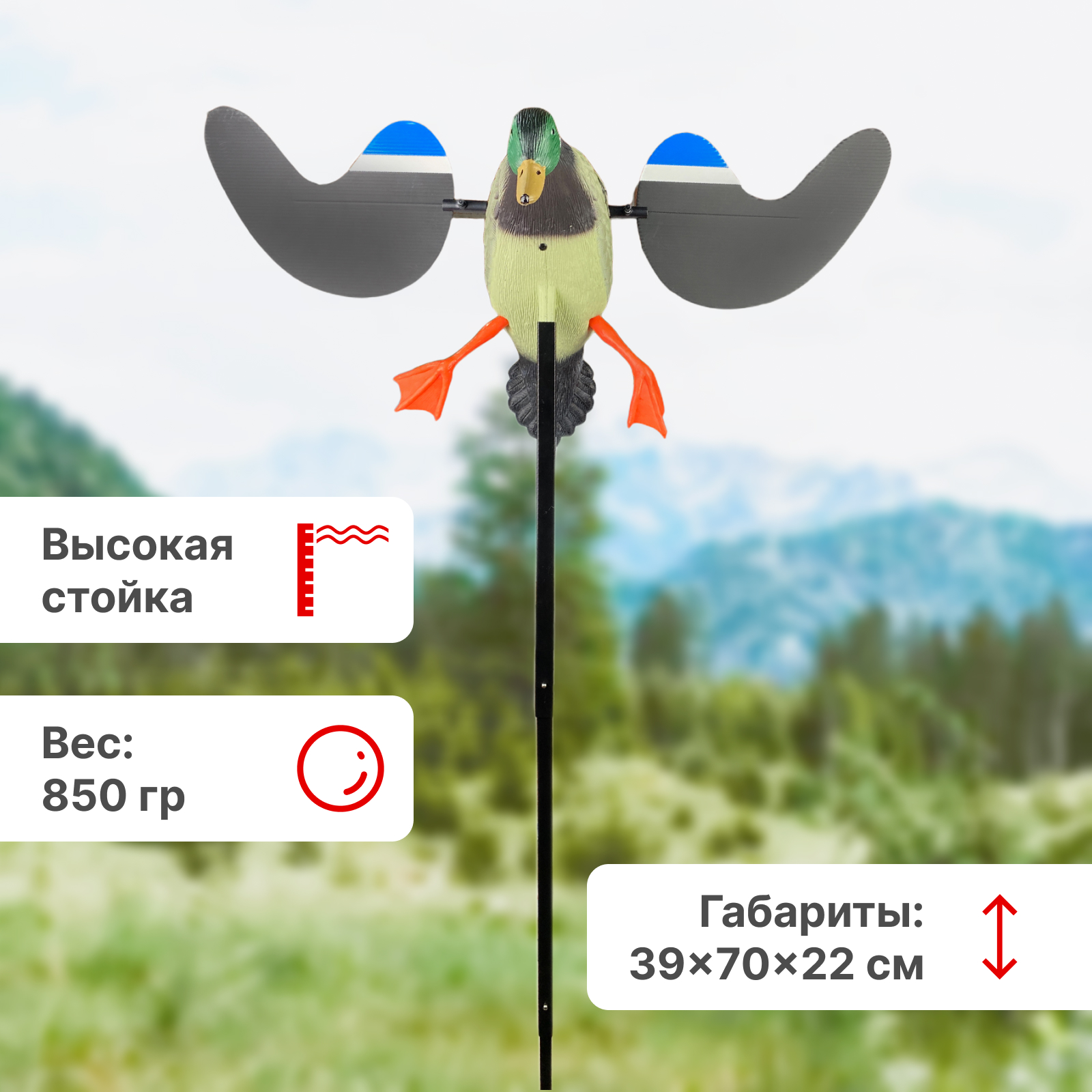 Механическое чучело Taigan Motorized rotating Mallard селезень — это надежный инструмент для охотников, который сочетает в себе реалистичность, удобство и эффективность. С его помощью вы сможете привлечь больше дичи и сделать охоту более увлекательной и успешной.