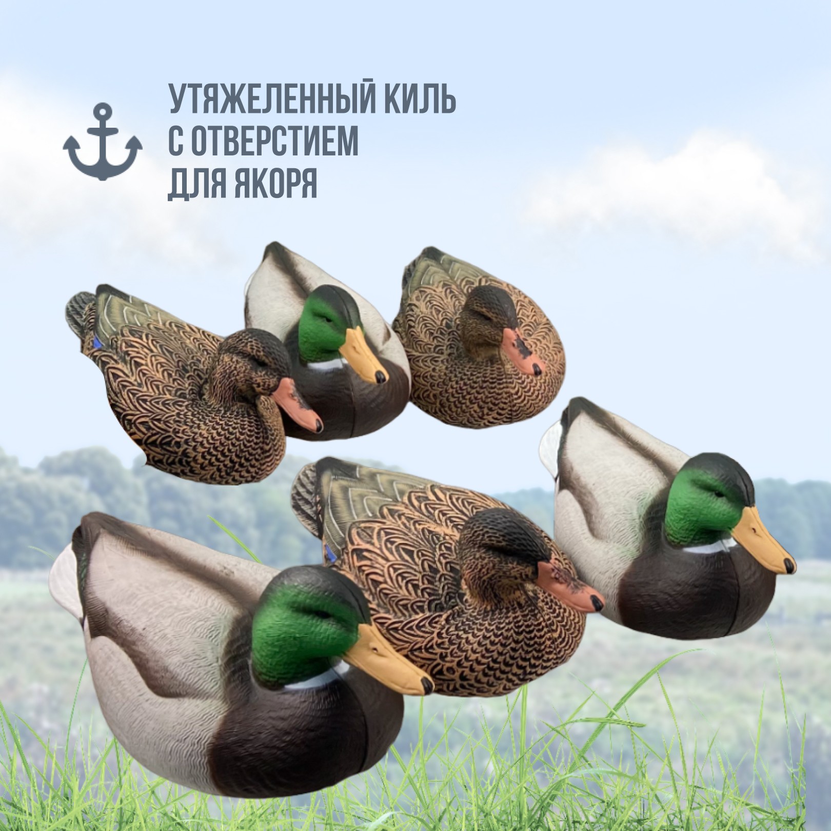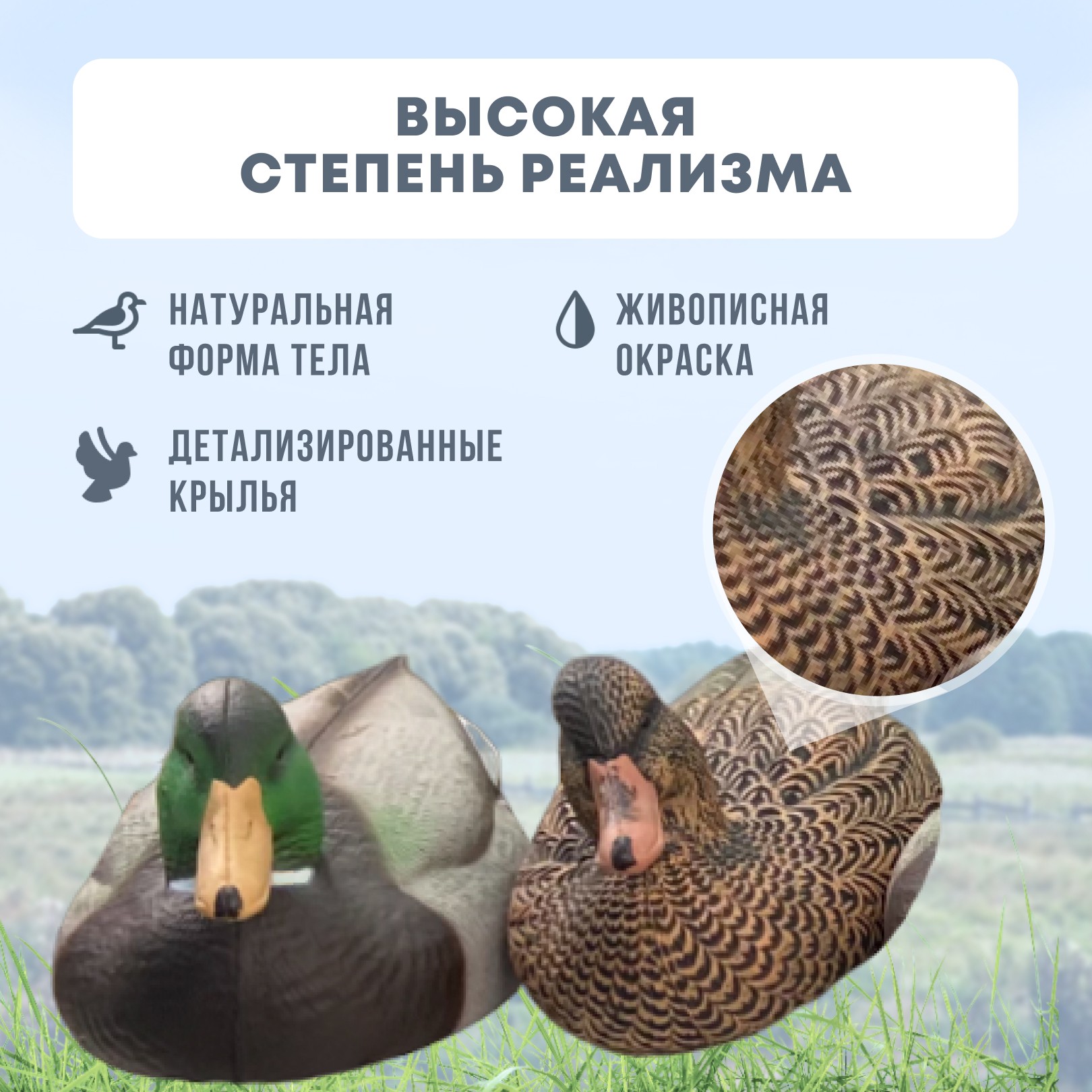 Реалистичный внешний видЧучела имеют детализированную прорисовку перьев, реалистичную форму тела и натуральную окраску. Это делает их практически неотличимыми от настоящих уток, что особенно важно для охоты на осторожных птиц.