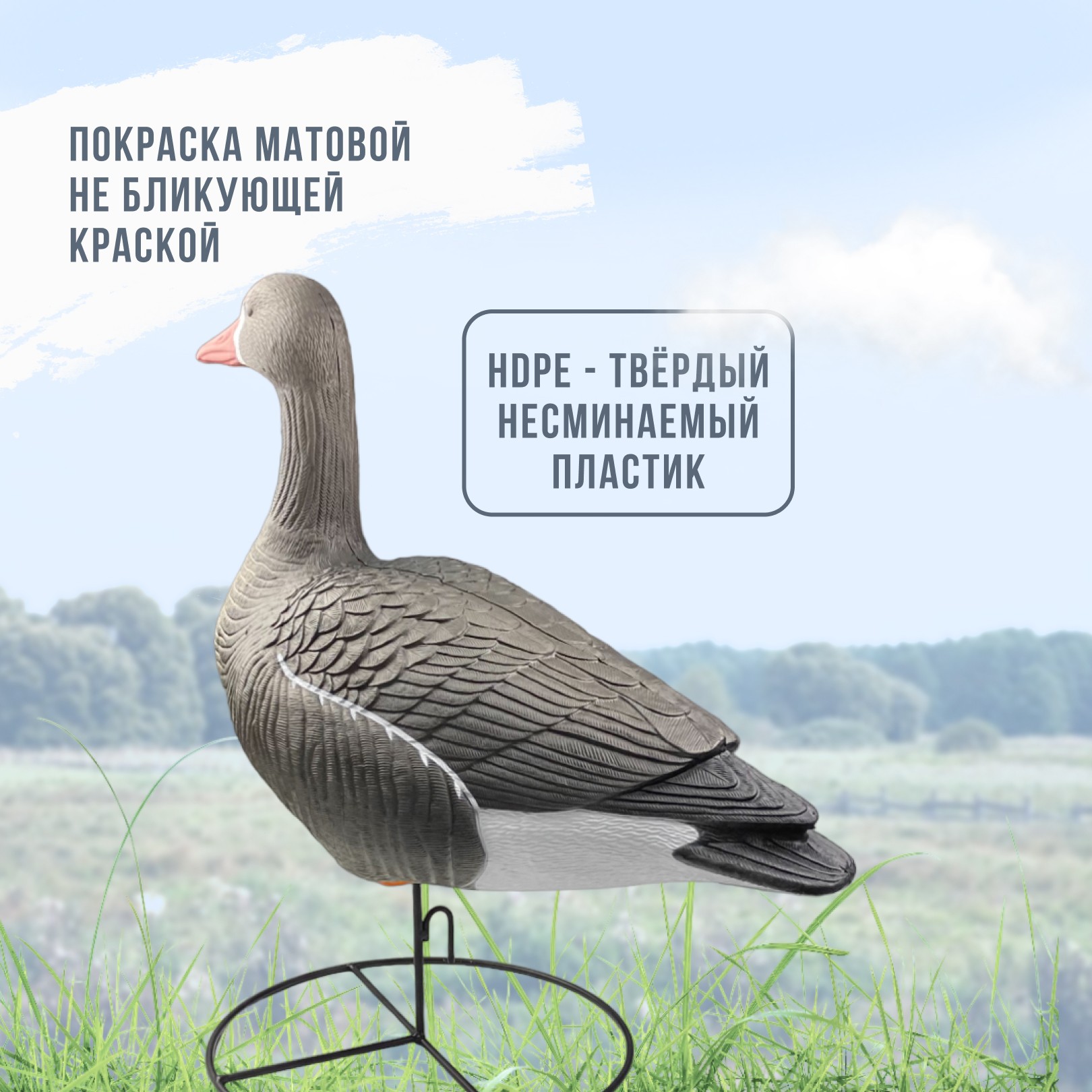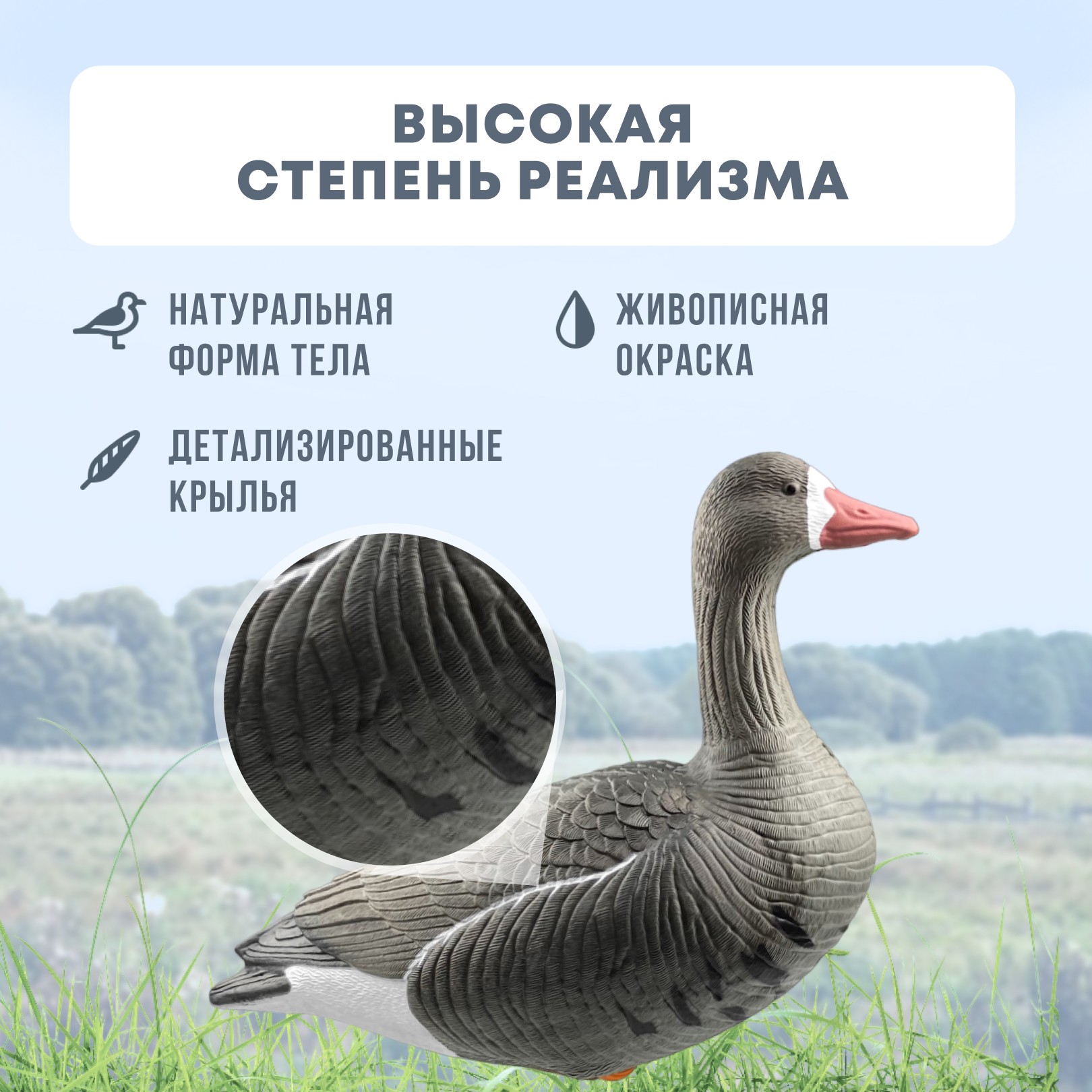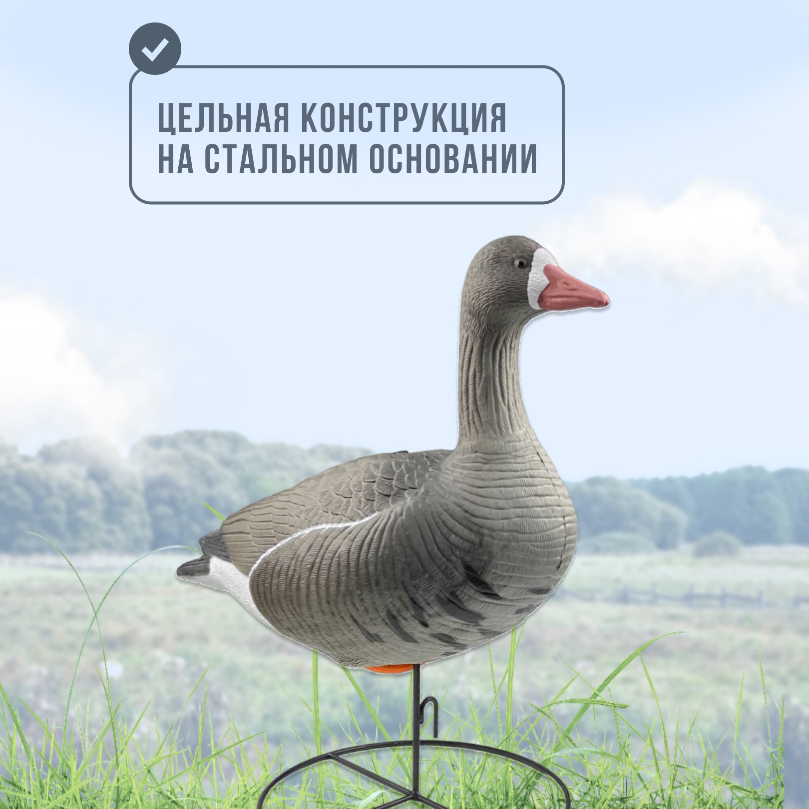 Реалистичный внешний видЧучело имеет детализированную прорисовку перьев и матовую небликующую окраску, что делает его практически неотличимым от настоящего гуся. Это особенно важно для охоты на осторожных птиц.
