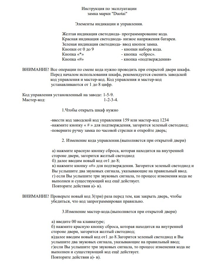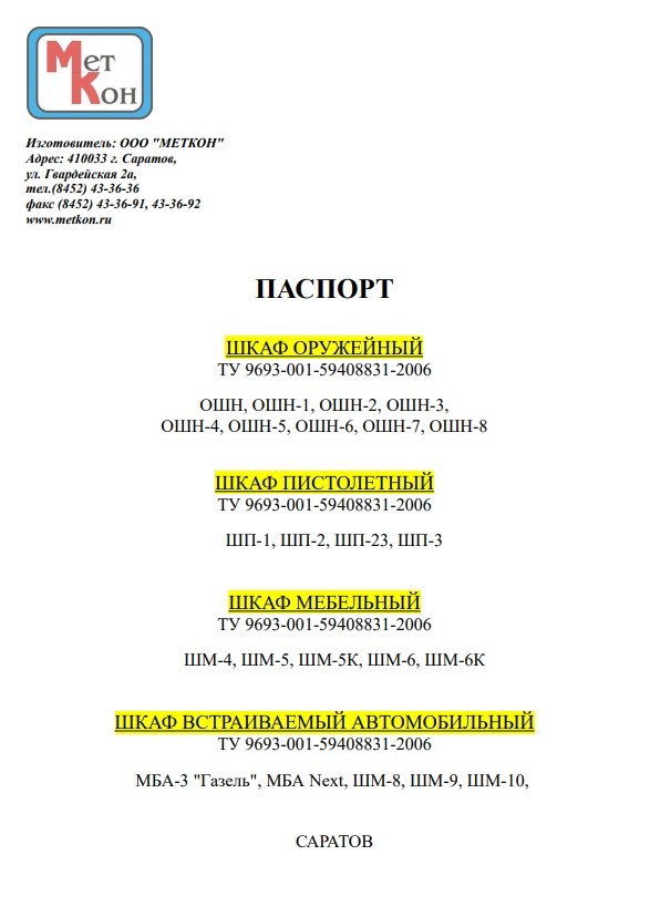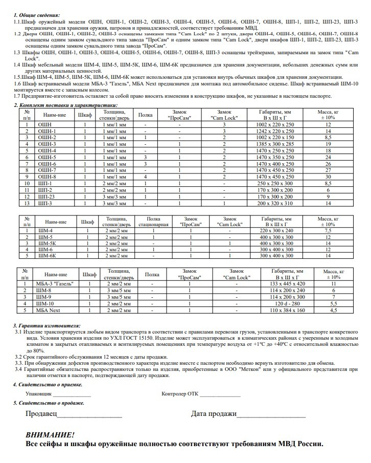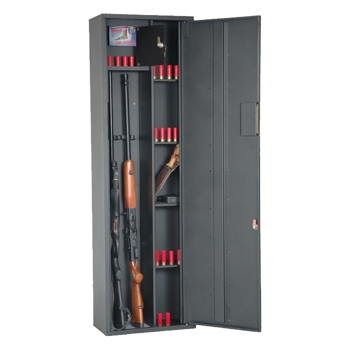 Шкаф предназначен для хранения 2 стволов оружия и оснащен отделением под патроны. Ложементы — пластик. В дверь установлены 1 электронный замок и 1 ключевой 8-ми сувальдный замок ЗАО «Про-Сам» г. Рязань или аналогичный замок другого производителя.