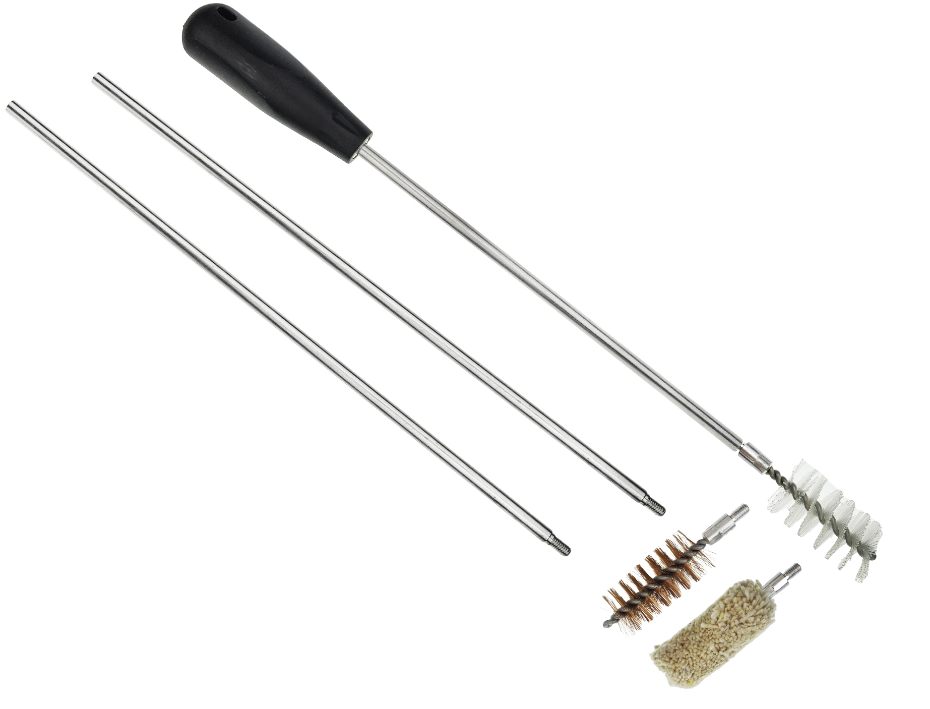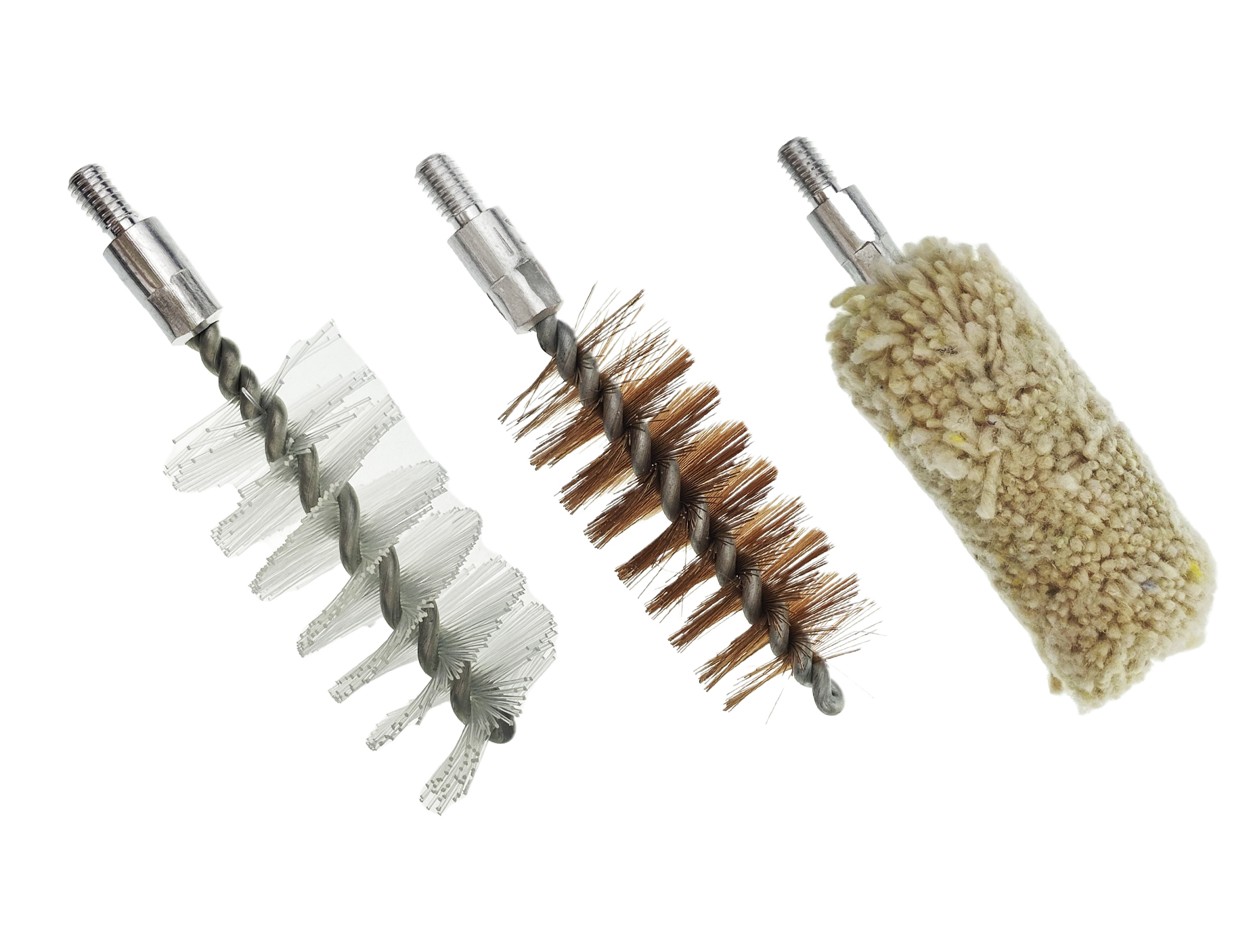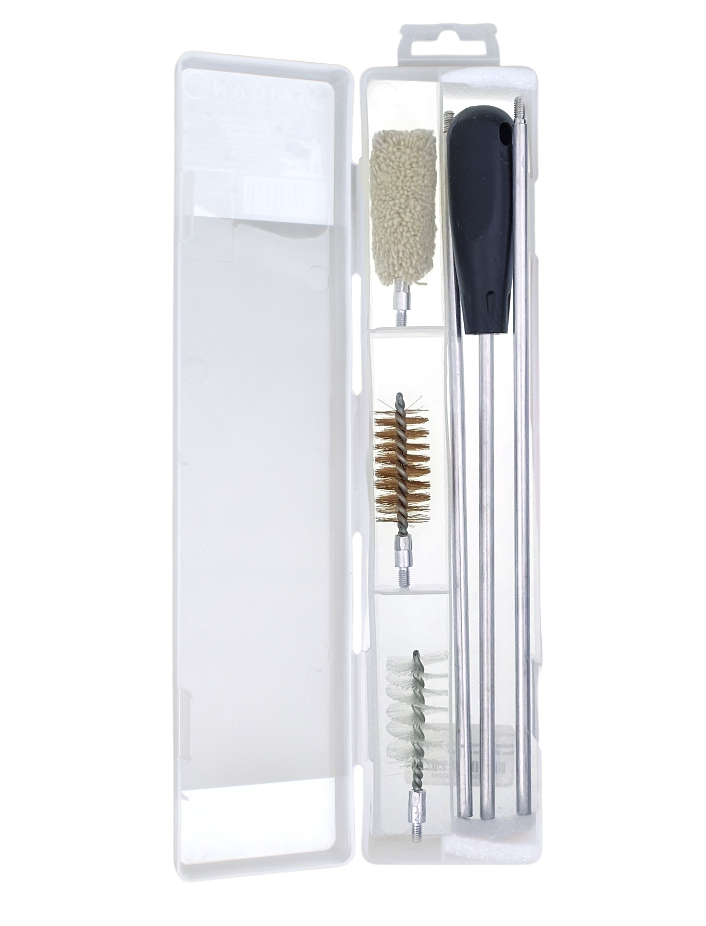 Набор имеет компактный размер и включает все необходимые базовые инструменты для чистки. В его состав входит алюминиевый шомпол с пластиковой ручкой, который обеспечивает удобство и точность во время чистки. Также в наборе присутствуют латунный ёрш, нейлоновый ёрш и ёрш-пуховик из хлопка, позволяющие осуществить тщательное удаление загрязнений и отложений из канала ствола.