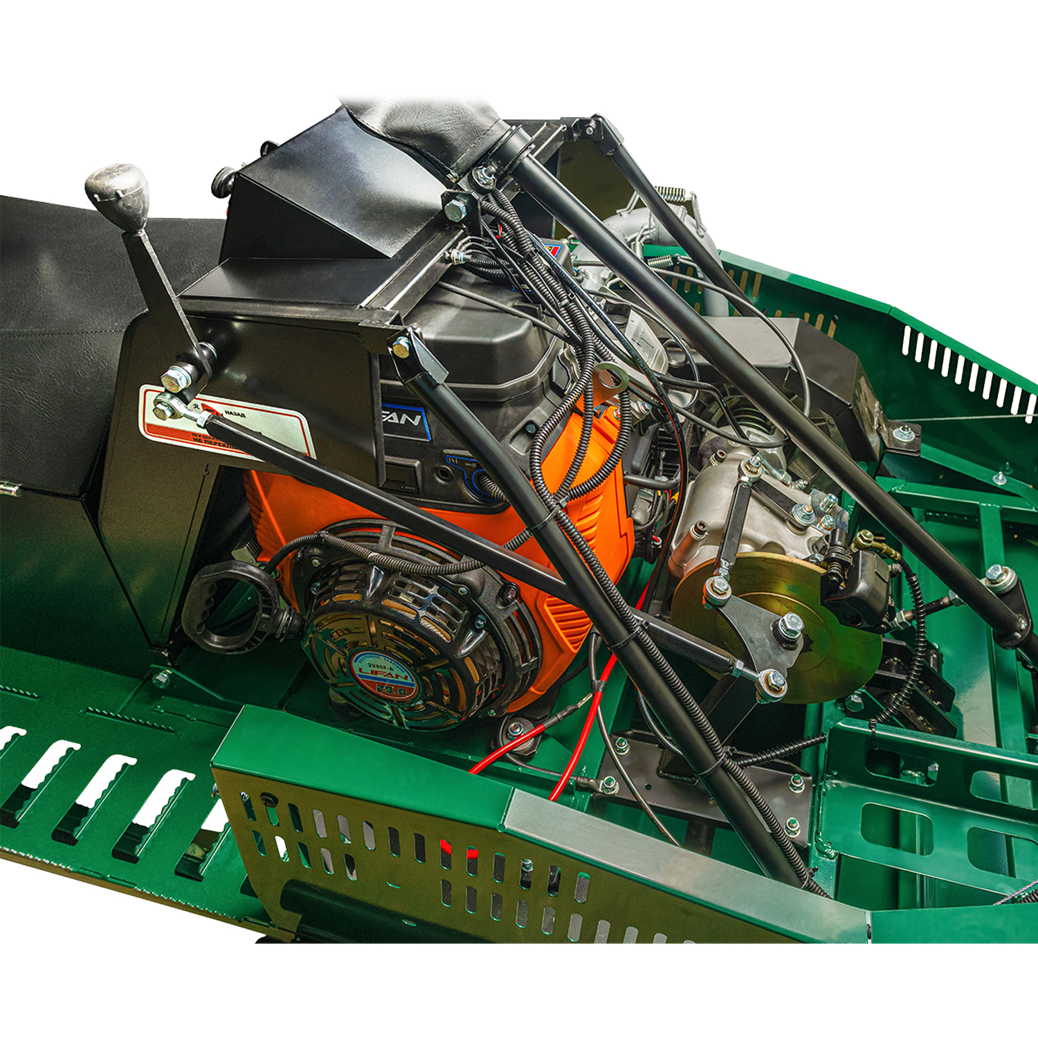 Снегоход оснащен 4-тактным бензиновым двигателем мощностью 29 л.с., что позволяет ему развивать скорость до 45 км/ч. Такая мощность обеспечивает отличную проходимость даже в сложных условиях, будь то глубокий снег или ледяная поверхность. Передний привод гарантирует надежное сцепление с поверхностью, что особенно важно при маневрировании.