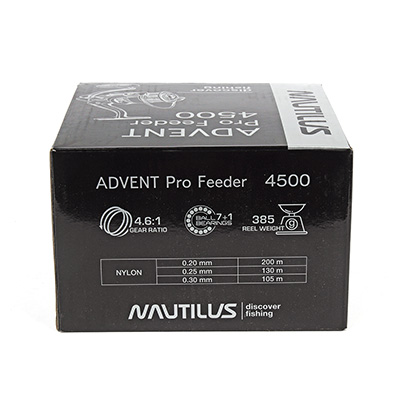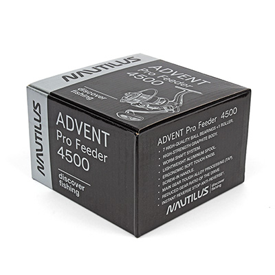 Nautilus Advent Pro Feeder - фидерная катушка, механизм которой выполнен по схеме с ” бесконечным винтом”. Комплектуется облегченной металлической рукояткой, ввинчивающейся в главную пару. Подшипник в ролике лесоукладывателя отвечает за безукоризненную работу этого узла. Сочетается с любыми фидерными удилищами. Отлично зарекомендовала себя в спортивной рыбалке.