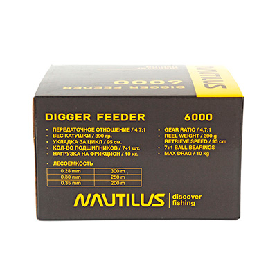 Современная фидерная катушка от компании Nautilus. Выпускается в размере 6000. За счет усиленного механизма и увеличенного диаметра шпули, обеспечивается отличная работа Digger Feeder с тяжелыми оснастками на дальних дистанциях.