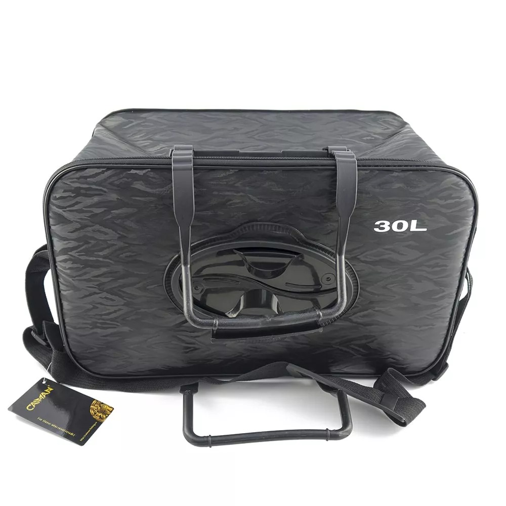 с клапаном, складная. Емкость изготовлена из водонепроницаемого материала, застегивается на молнию, имеет ручки и наплечный ремешок для переноски. Длина 43 см, ширина 27 см, высота 26 см, объём 30 л. В крышке расположено отверстие, оснащенное клапаном.