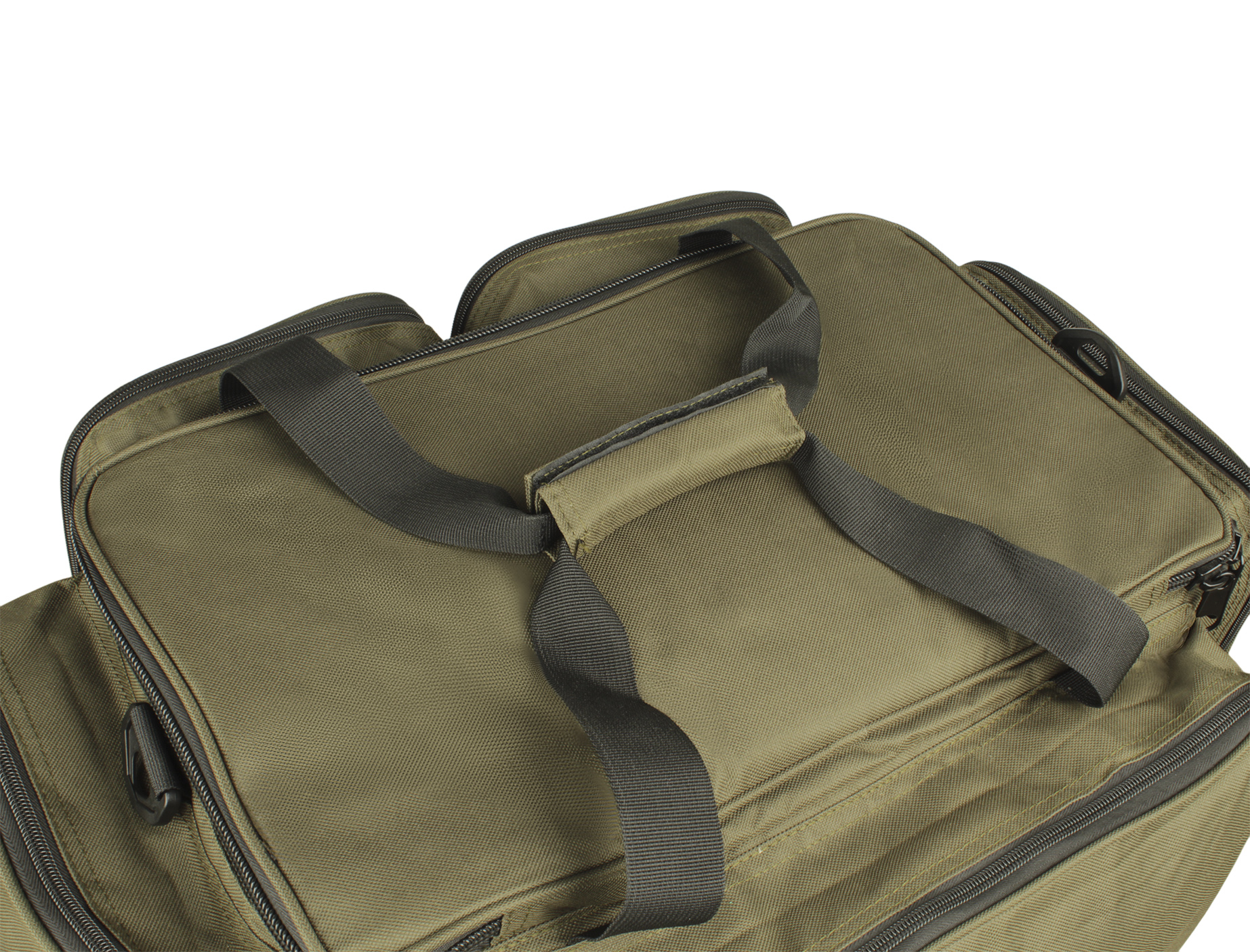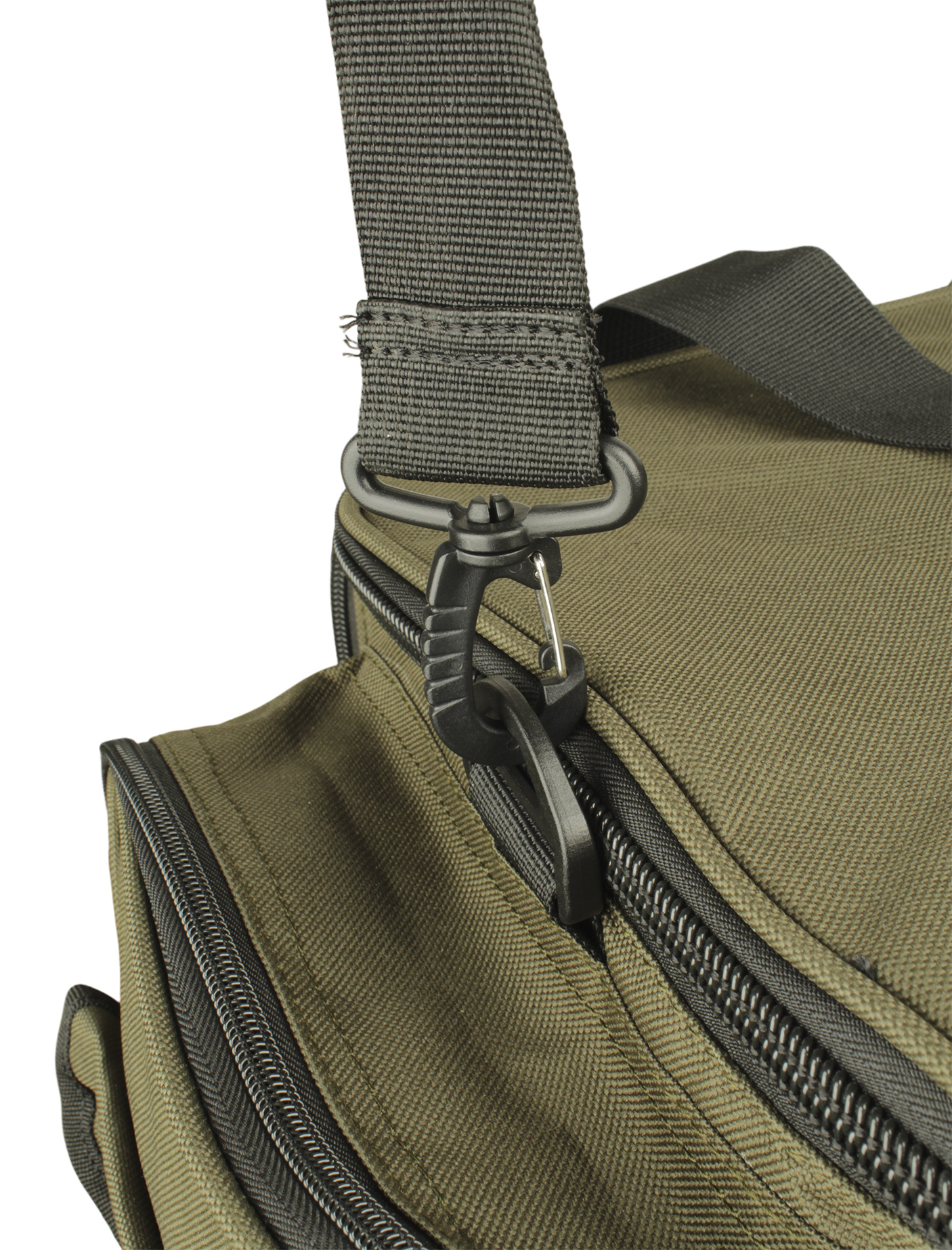 Комфортная транспортировкаМягкий плечевой ремень и эргономичная ручка с фиксацией на липучке делают транспортировку сумки удобной даже при полной загрузке. Это позволяет легко переносить снаряжение между рыболовными местами.