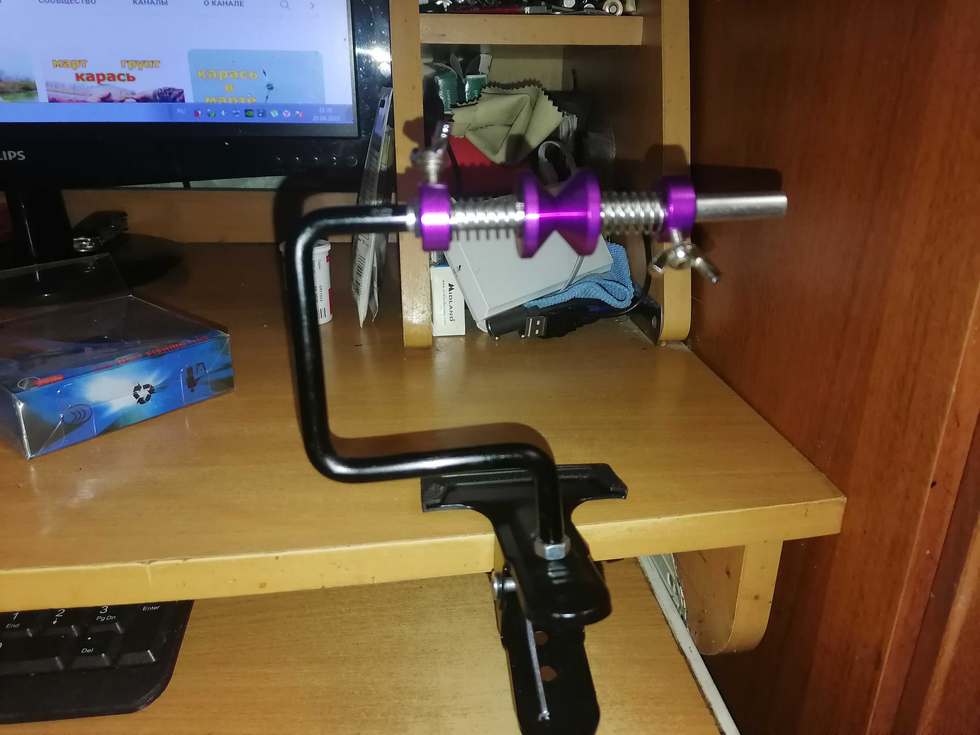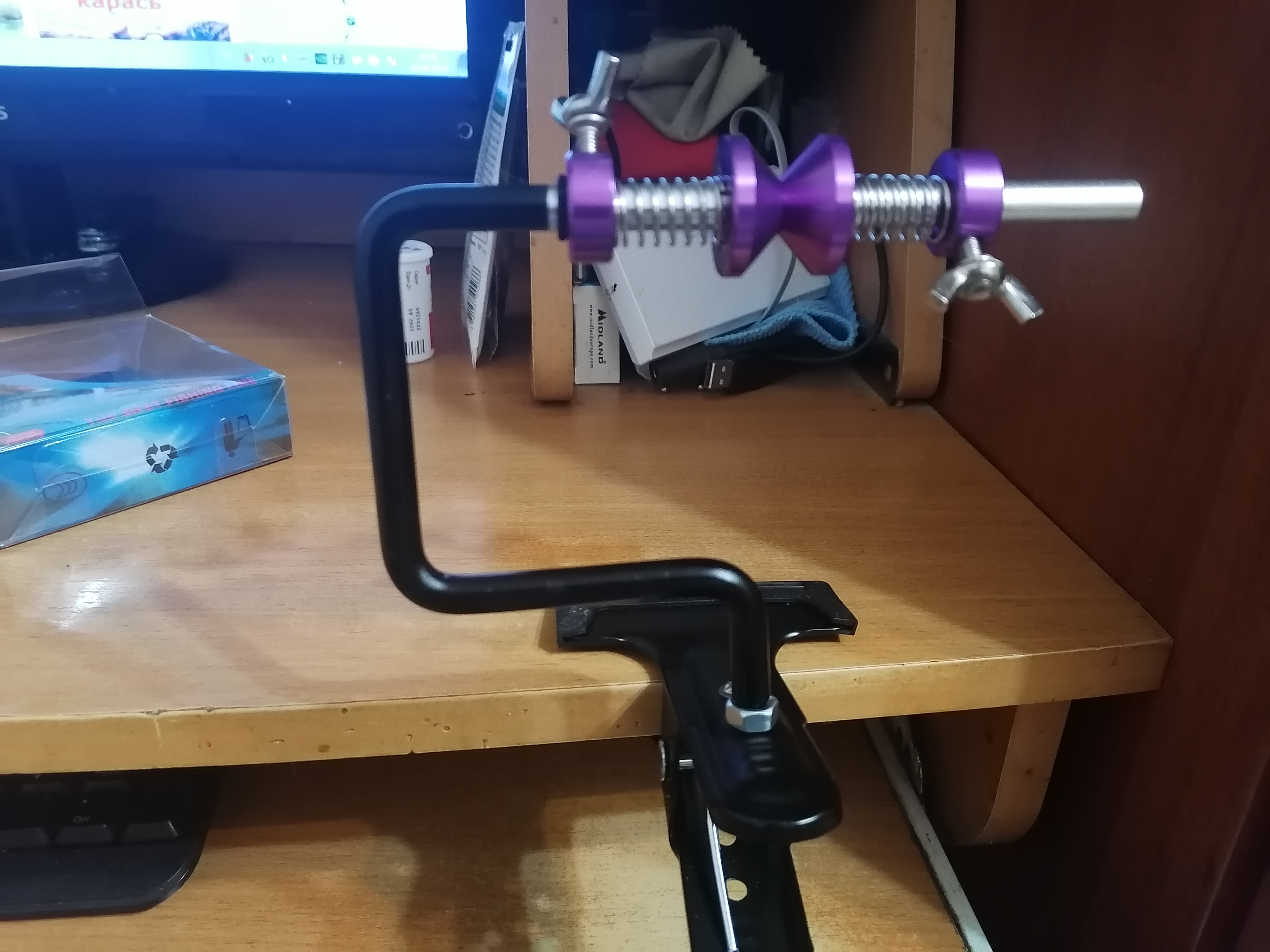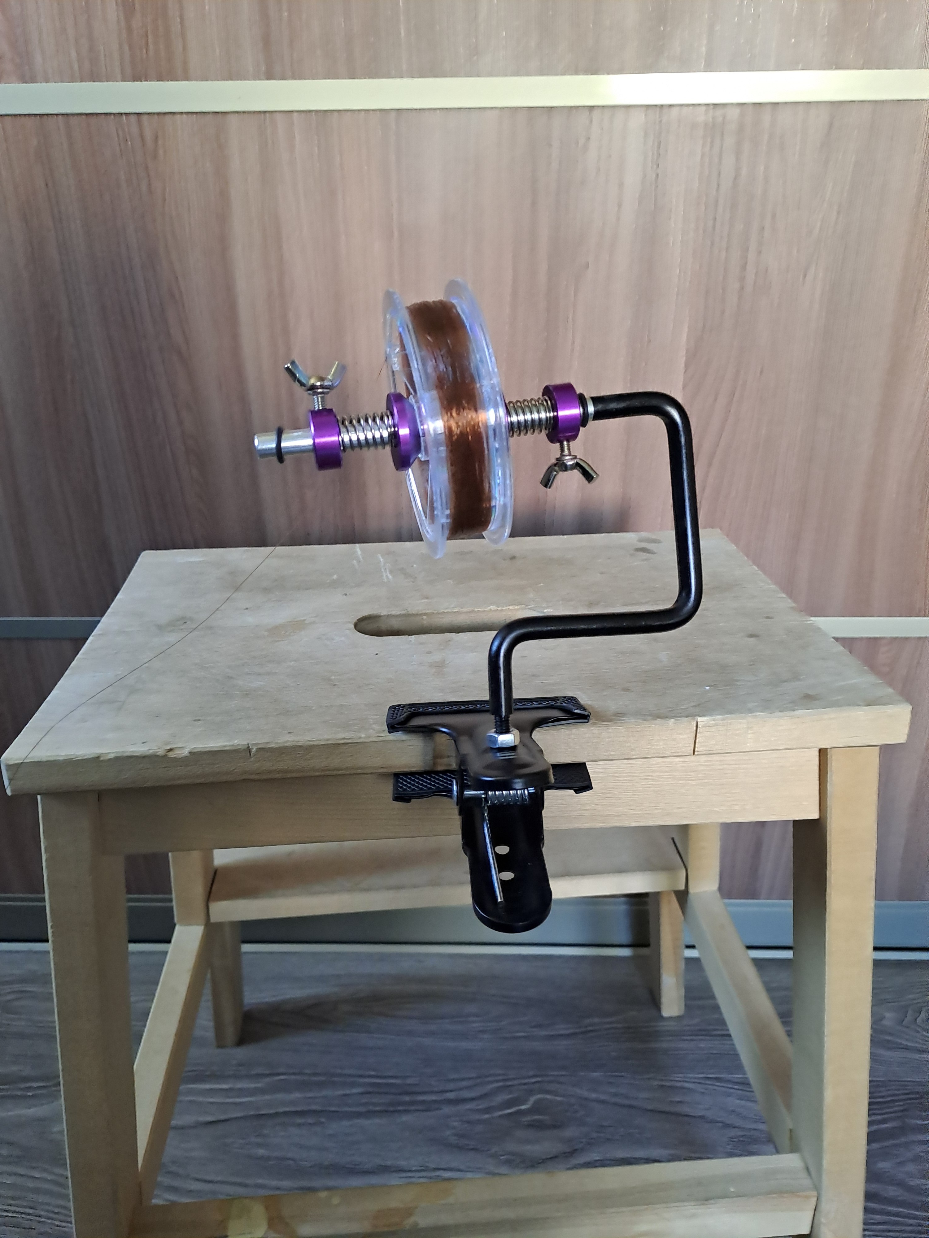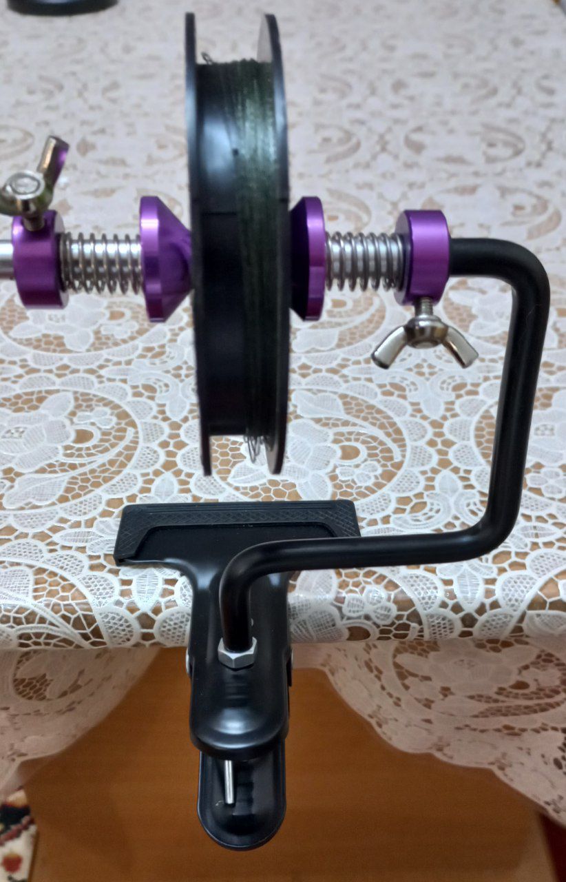 Этот портативный инструмент изготовлен из анодированного алюминия и предназначен для намотки лески на катушку. Он оснащен держателем, который позволяет закрепить его на краю стола или другой подходящей поверхности.