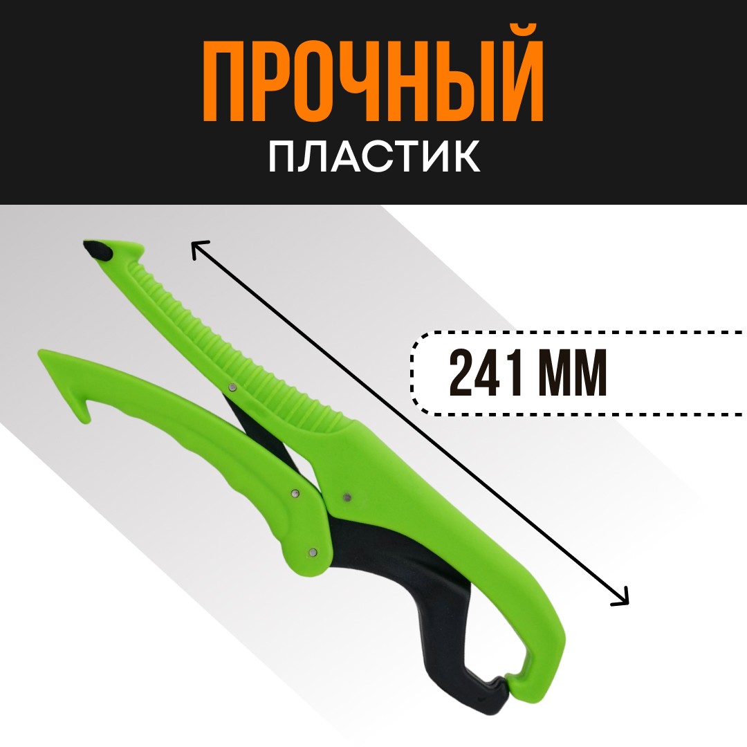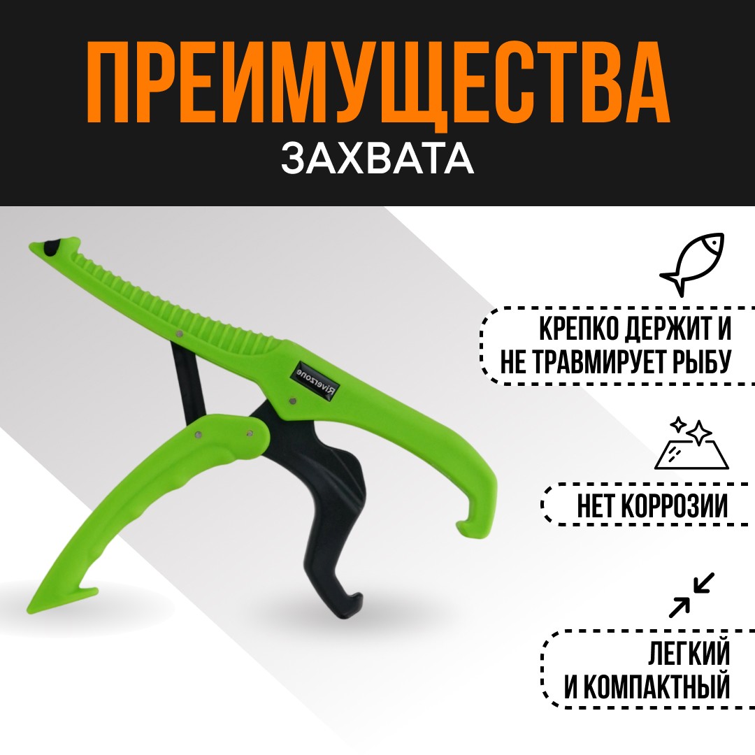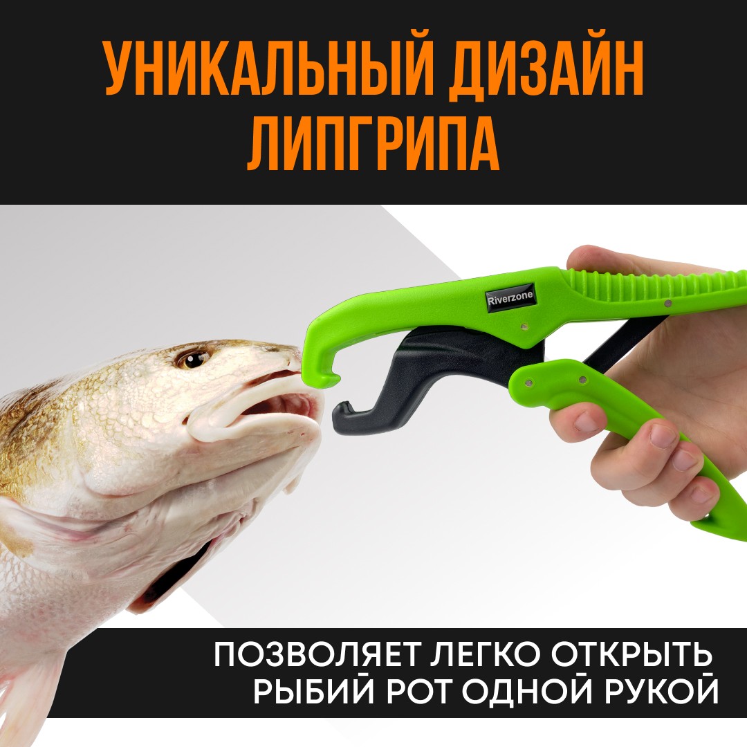 Особенности липгрипаLip grip - это инструмент, который используется для удержания рыбПодробнее включают возможность надежно удерживать рыбу одной рукой, легкость и механизм быстрого отсоединения, который прочен, а также устойчив к коррозии. Захват обладает хорошей плавучестью и ярким окрасом, что затрудняет возможность его потери. Выдерживает максимальный вес рыбы до 50 кг (110 lb).