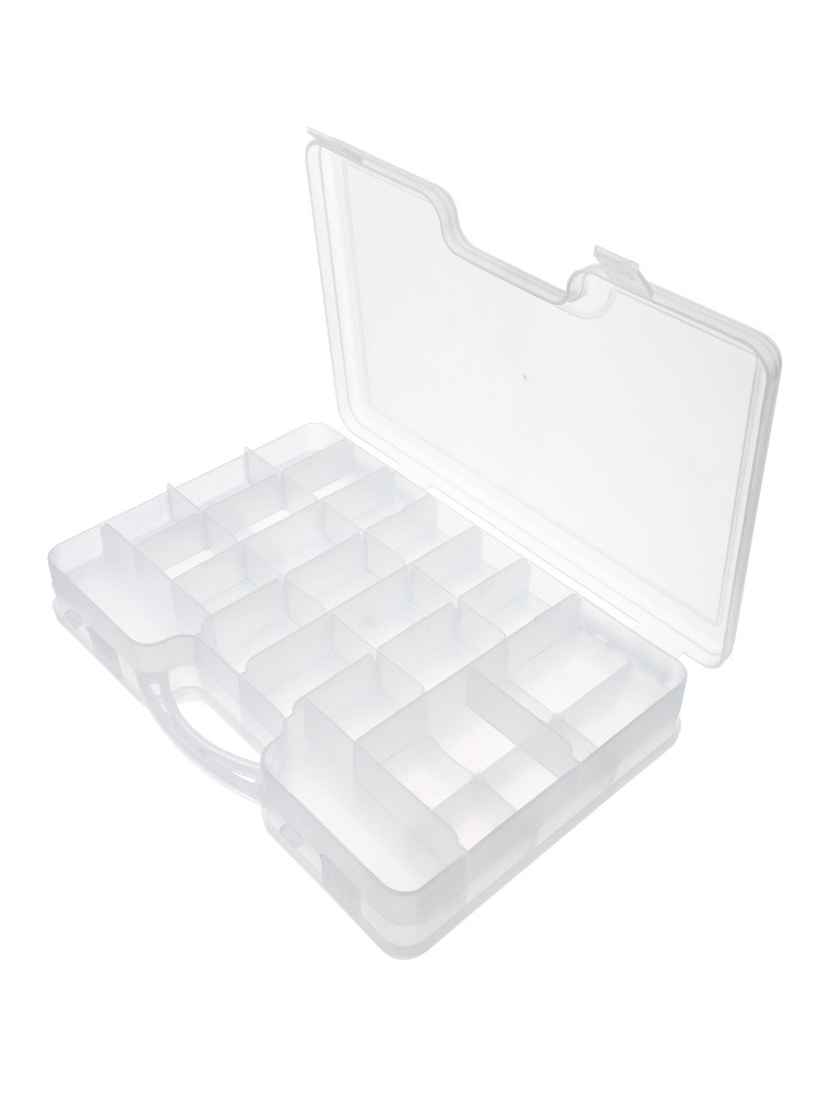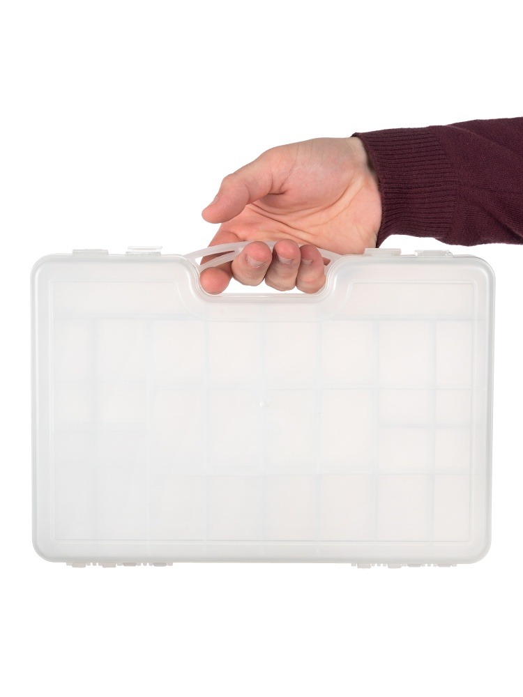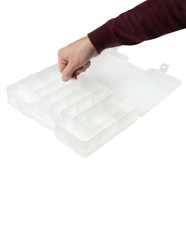 Кейс идеально подходит для мелочей: грузики, блесна, поплавки, нипельные резиночки, стопорки и крючки. Кейс двусторонний, имеет 2 симметричных отделения, с помощью регулируемых перегородок можно создавать ячейки нужного размера, в которые возможно поместить более крупные снасти: воблеры и твистеры.