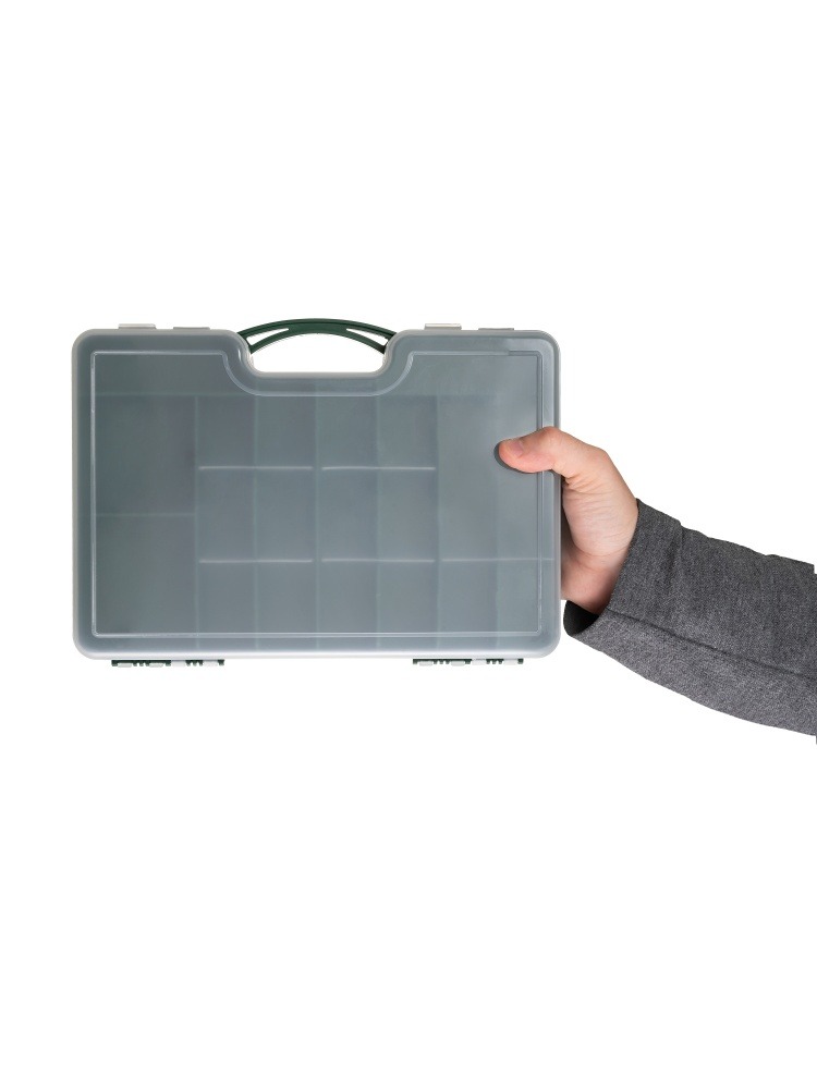 Кейс идеально подходит для мелочей: грузики, блесна, поплавки, нипельные резиночки, стопорки и крючки. Кейс двусторонний, имеет 2 симметричных отделения, с помощью регулируемых перегородок можно создавать ячейки нужного размера, в которые возможно поместить более крупные снасти: воблеры и твистеры.
