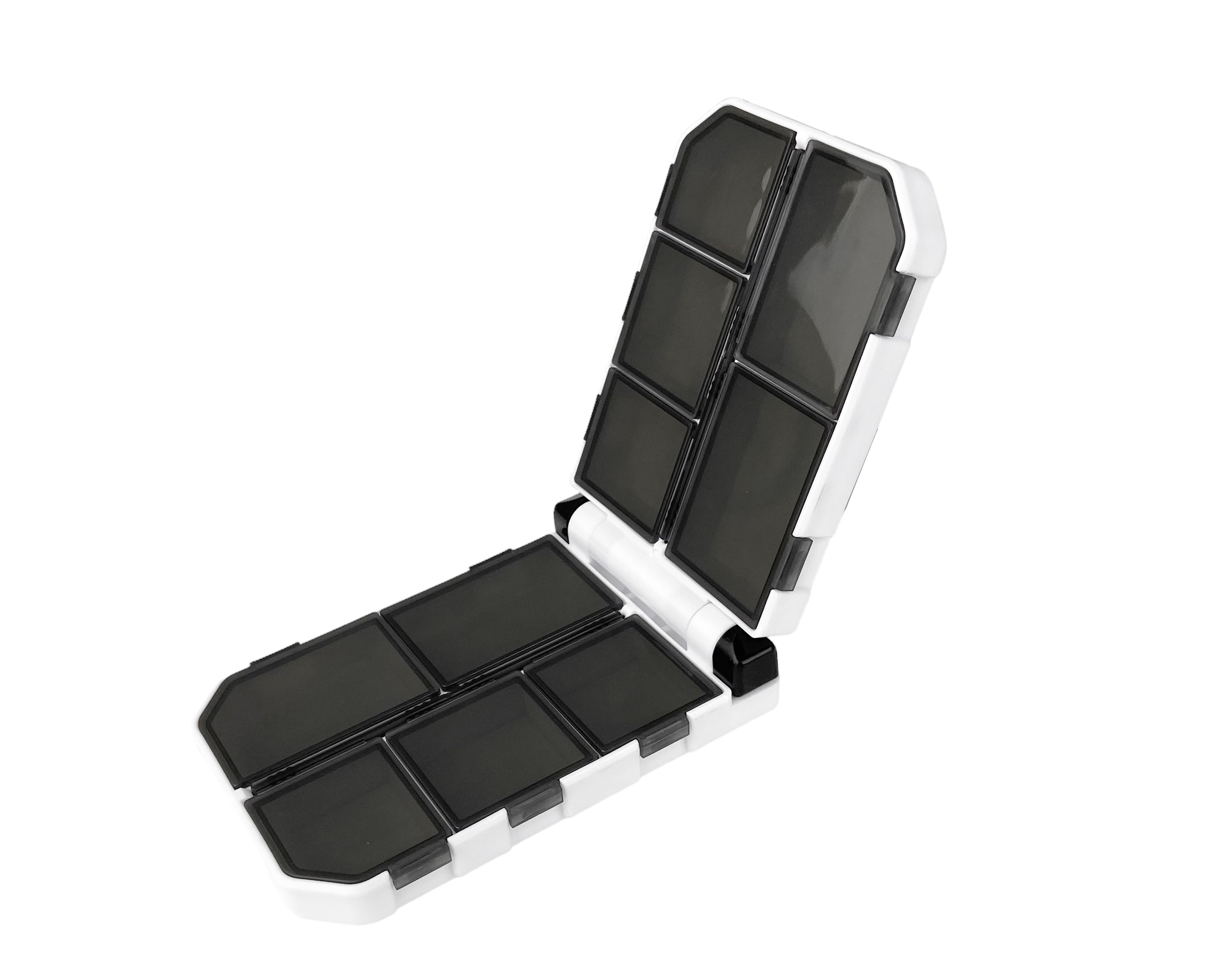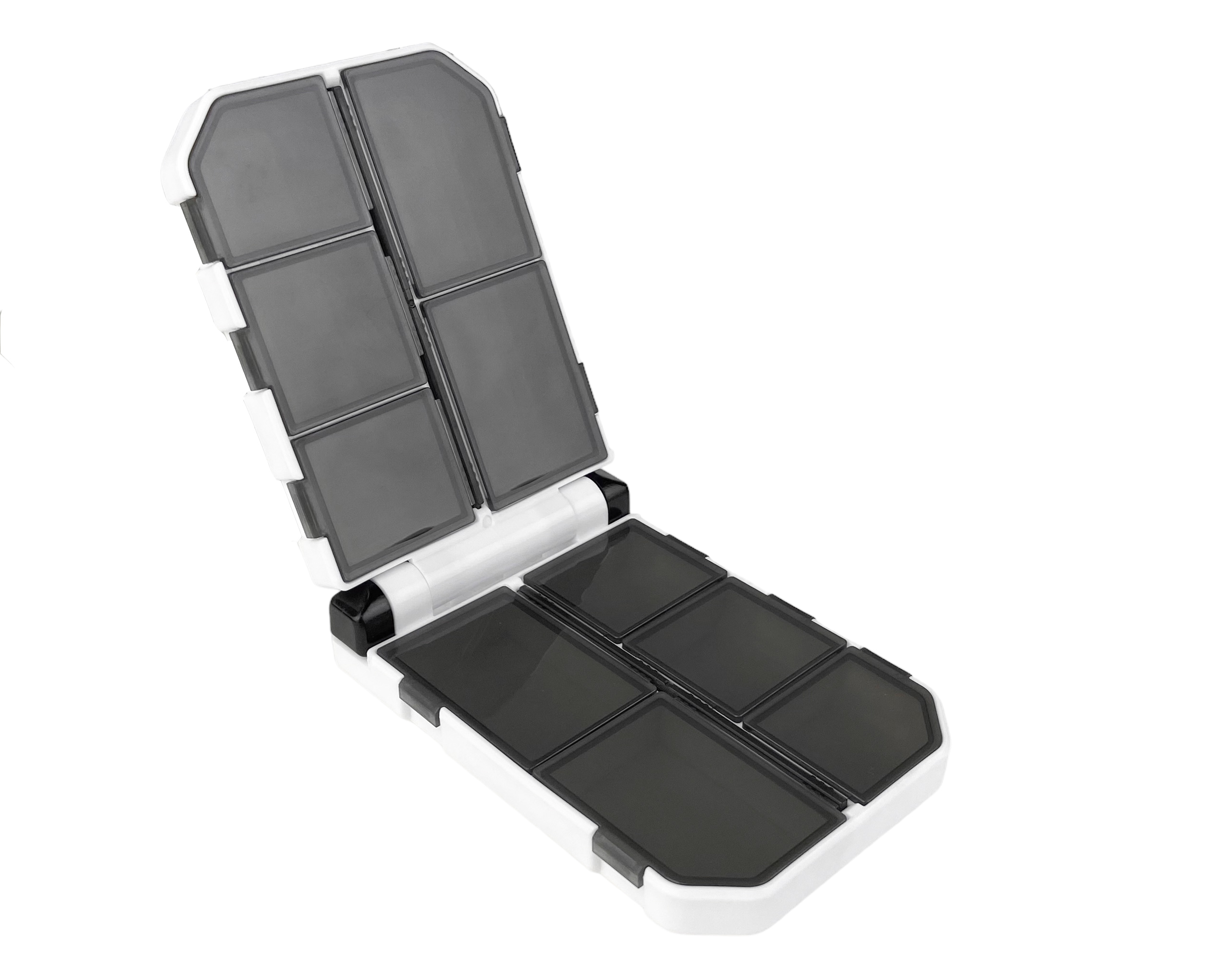 Компактная складная коробочка для хранения нахлыстовых мушек, приманок, крючков и другой рыболовной мелочёвки с надёжной защёлкой. И отверстием для шнурка. 10 ячеек с крышками.
