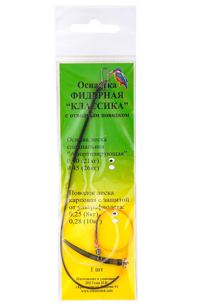 Нижний отвод с карабином для быстрого крепления или замены кормушки надежно защищен термоусадочной трубочкой. Это позволяет ловить в водоёмах с речными моллюсками (перловица и дрейссена) и препятствует повреждению основы. Поводок находится между двумя силиконовыми стопорами на вертлюге-быстросъёме, что позволяет быстро заменить поводок. Место соединения поводка с быстросъёмом защищено конектором. Он же придает жесткость и отводит поводок в сторону от кормушки. Поводок Ø 0,25 мм - 100 см длиной (разрывная нагрузка 8 кг). Выбор крючка и насадки на ваше усмотрение. Силиконовые стопора можно перемещать и раздвигать между собой. Таким образом меняется свободный ход поводка, что позволяет рыбе самозасекаться.