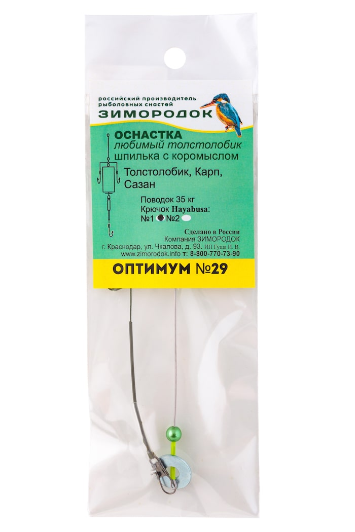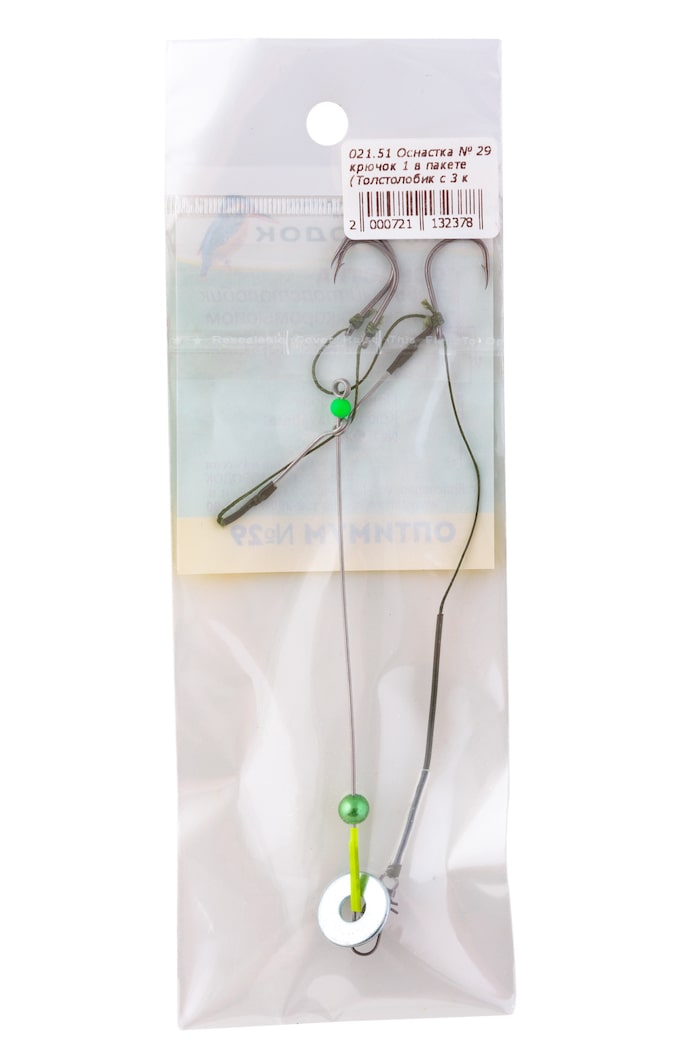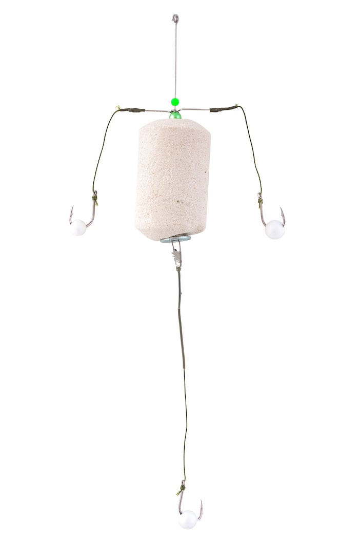 Рассмотрим донный вариант! Используется скользящий груз на усмотрение рыболова, который одевается на Вашу основную леску или плетенку. Через груз пропускается леска и привязывается за кольцо оснастки № 29. Затем, отстёгивается карабин от шпильки, снимается шайба. Теперь шпилька вставляется в отверстие на технопланктоне. Технопланктон поднимается вверх, фиксируя малое коромысло в верхней части. Затем одевается шайба — она удерживает технопланктон от сползания при растворении на поводок. Пристегивается карабин поводка. На крючки нанизывается шарик пенопласта Ø от 8мм на крючок № 1. Шариком оснащаются все 3 крючка.
