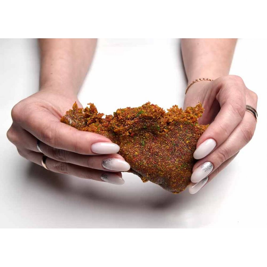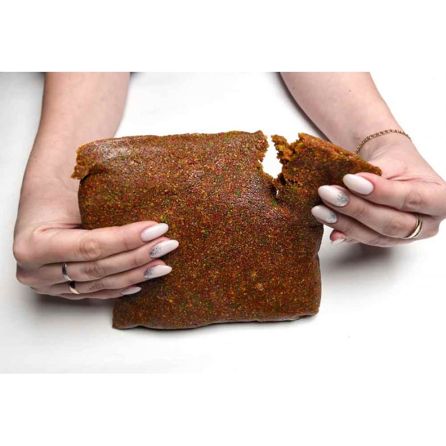 - Структура пластилина содержит цветные компоненты в виде мелкого пеллетса красного, зеленого и желтого цвета, что придает пластилину дополнительную привлекательность.