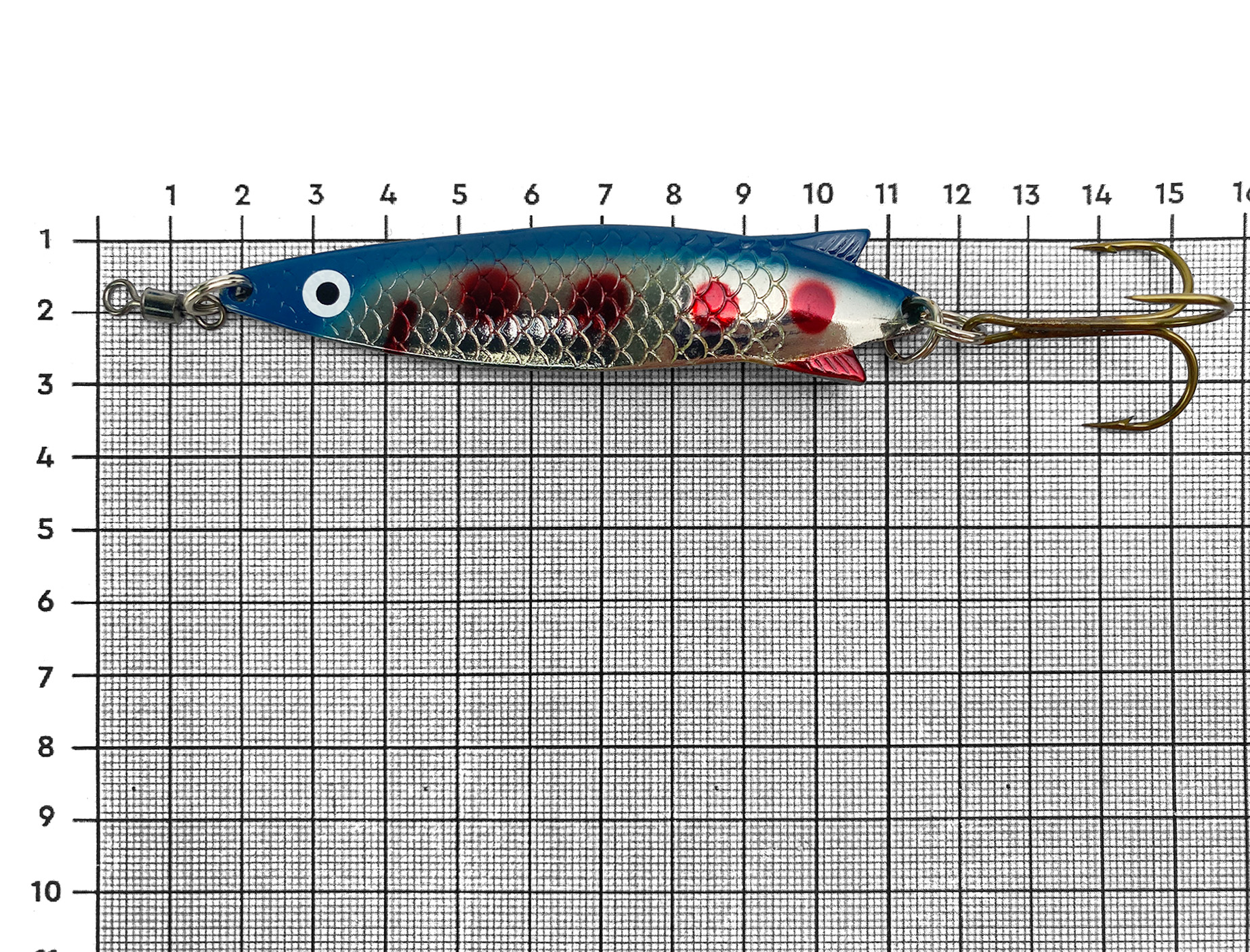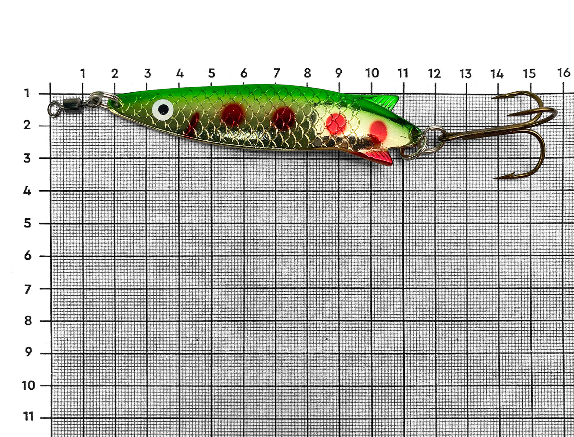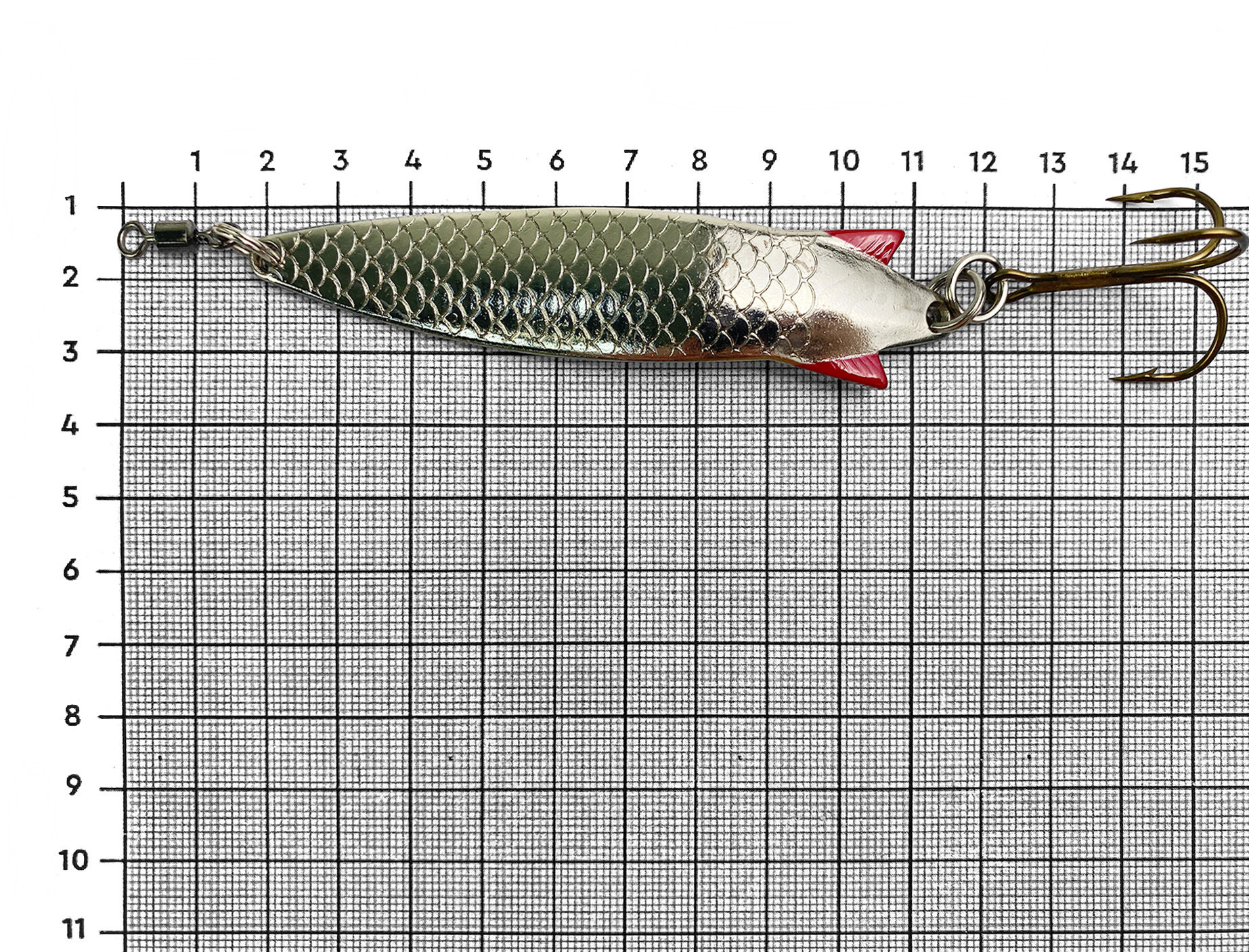 Вытянутый корпус колебалки имеет два небольших плавничка внизу и покрыт рифлением, которое воспроизводит очертания чешуи. Блесна без труда достигает отдаленных перспективных точек при забросах. Соблазнительная игра не сбивается даже на течении. Потому поймать с такой приманкой можно как зубастую щуку и вездесущего окуня, так и судака, форель, жереха, ленка, хариуса, кумжу, тайменя и т.д.