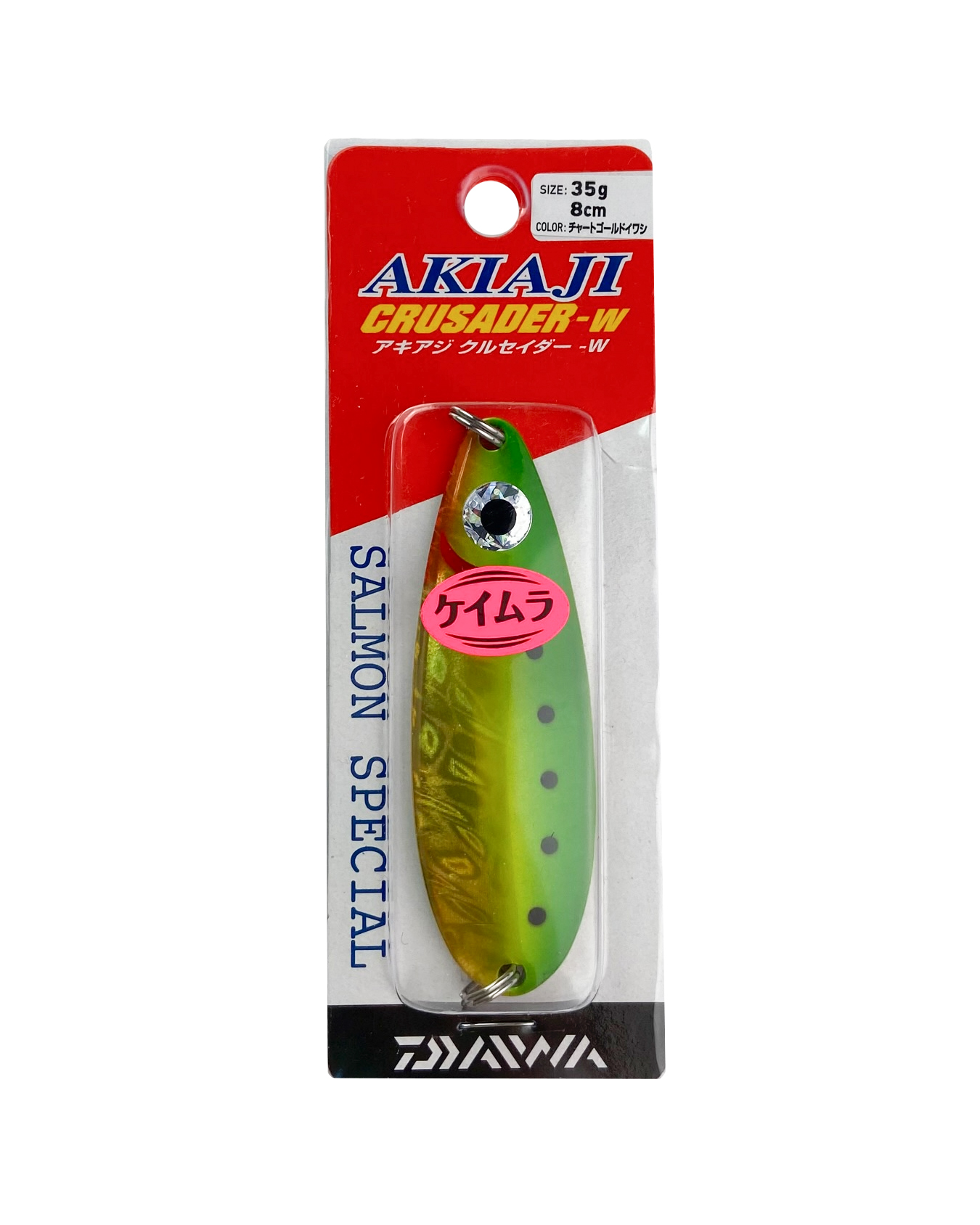 Блесны Akiaji Crusader W – тяжелые спиннинговые приманки среднего размера, предназначенные для охоты за трофейным хищником семейства лососевых. Имеют широкую, размашистую игру. Расцветки блесен серии Akiaji Crusader заточены под ловлю проходного лосося в различных условиях. В воде приманка создает привлекательные световые блики, которые быстро привлекают внимание рыбы и провоцируют её на атаку. Блесна Akiaji Crusader W 35g не оснащается крючком – рыболов сам выбирает и устанавливает его в зависимости от условий рыбалки и предполагаемого размера добычи.