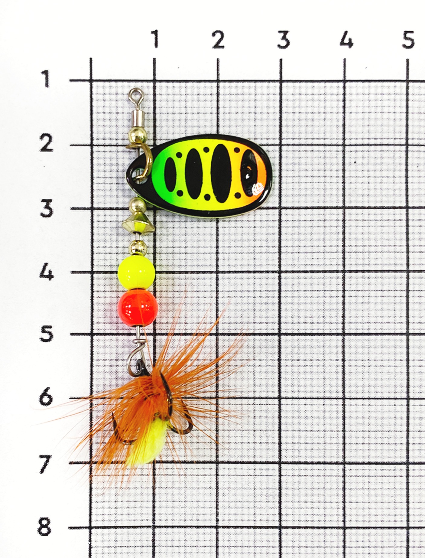 Приманка оснащена тройниками с мушкой. Это позволяет решить сразу несколько задач: выполняется маскировка тройника, осуществляется стабилизация задней части блесны при проводке и, самое главное, мушка служит дополнительной изюминкой для привлечения хищника.