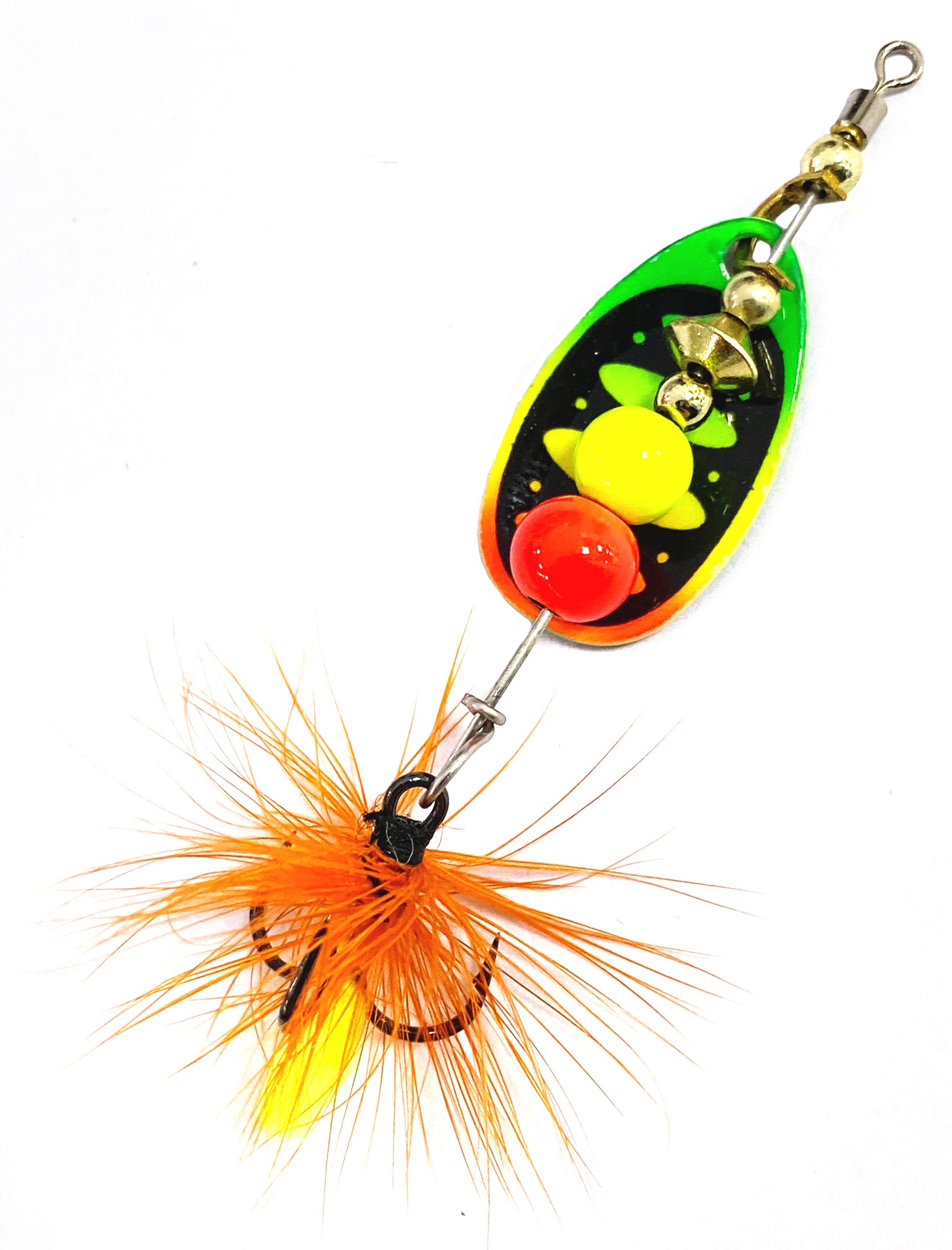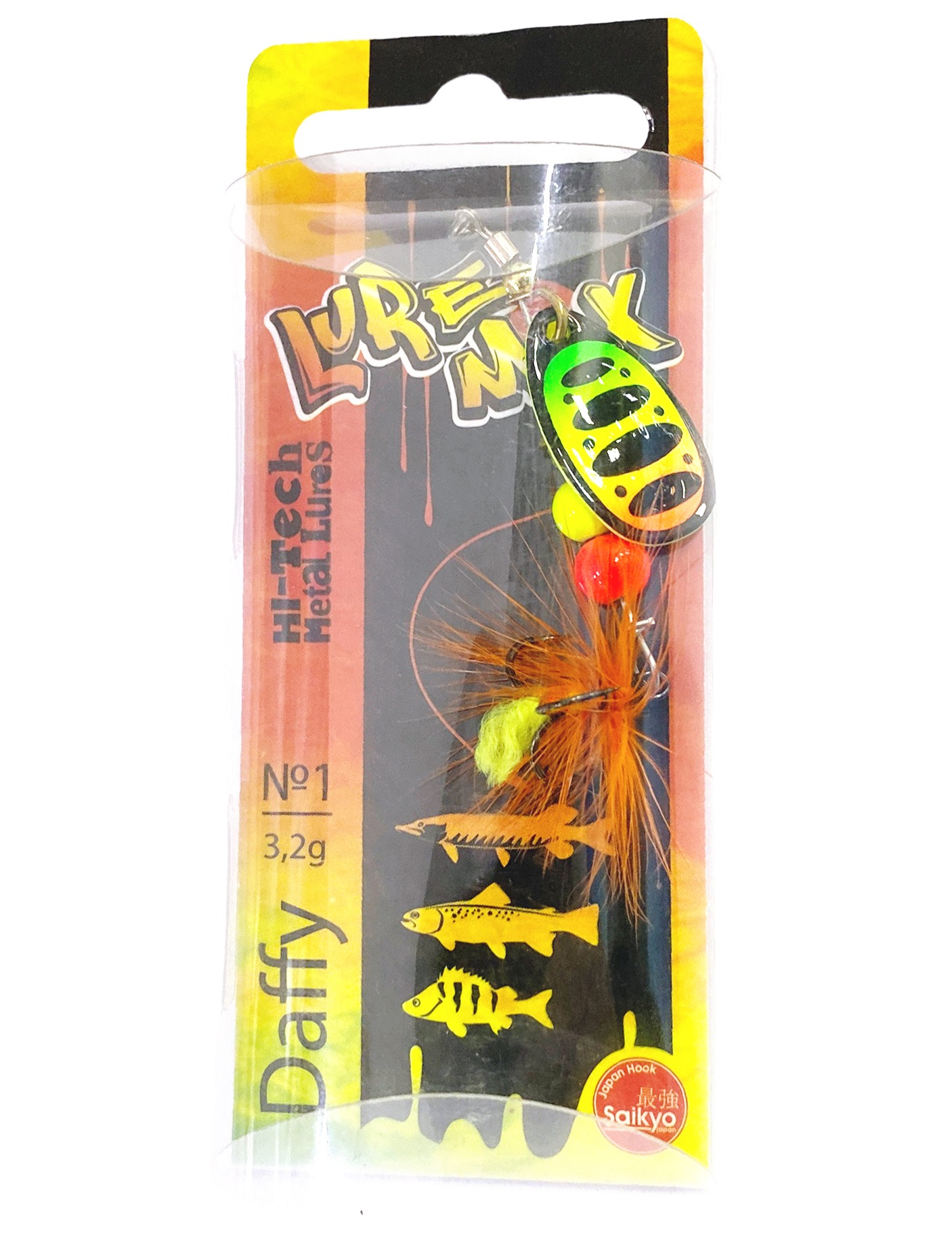 Daffy - вращающаяся блесна с широким лепестком, который при вращении отклоняется от оси на угол 50-55 градусов, что позволяет использовать эту приманку как на течении, так и в стоячей воде.