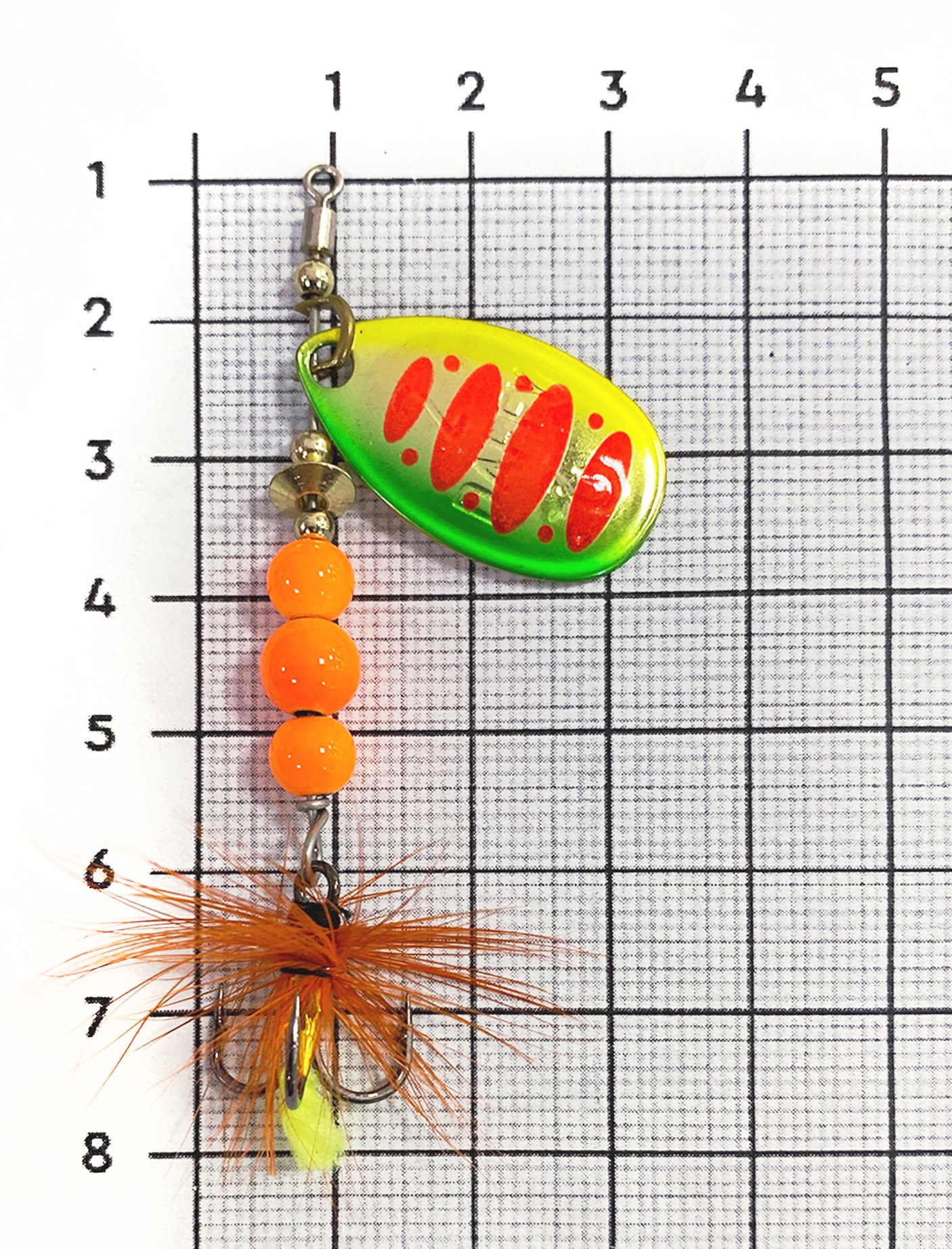 Приманка оснащена тройниками с мушкой. Это позволяет решить сразу несколько задач: выполняется маскировка тройника, осуществляется стабилизация задней части блесны при проводке и, самое главное, мушка служит дополнительной изюминкой для привлечения хищника.