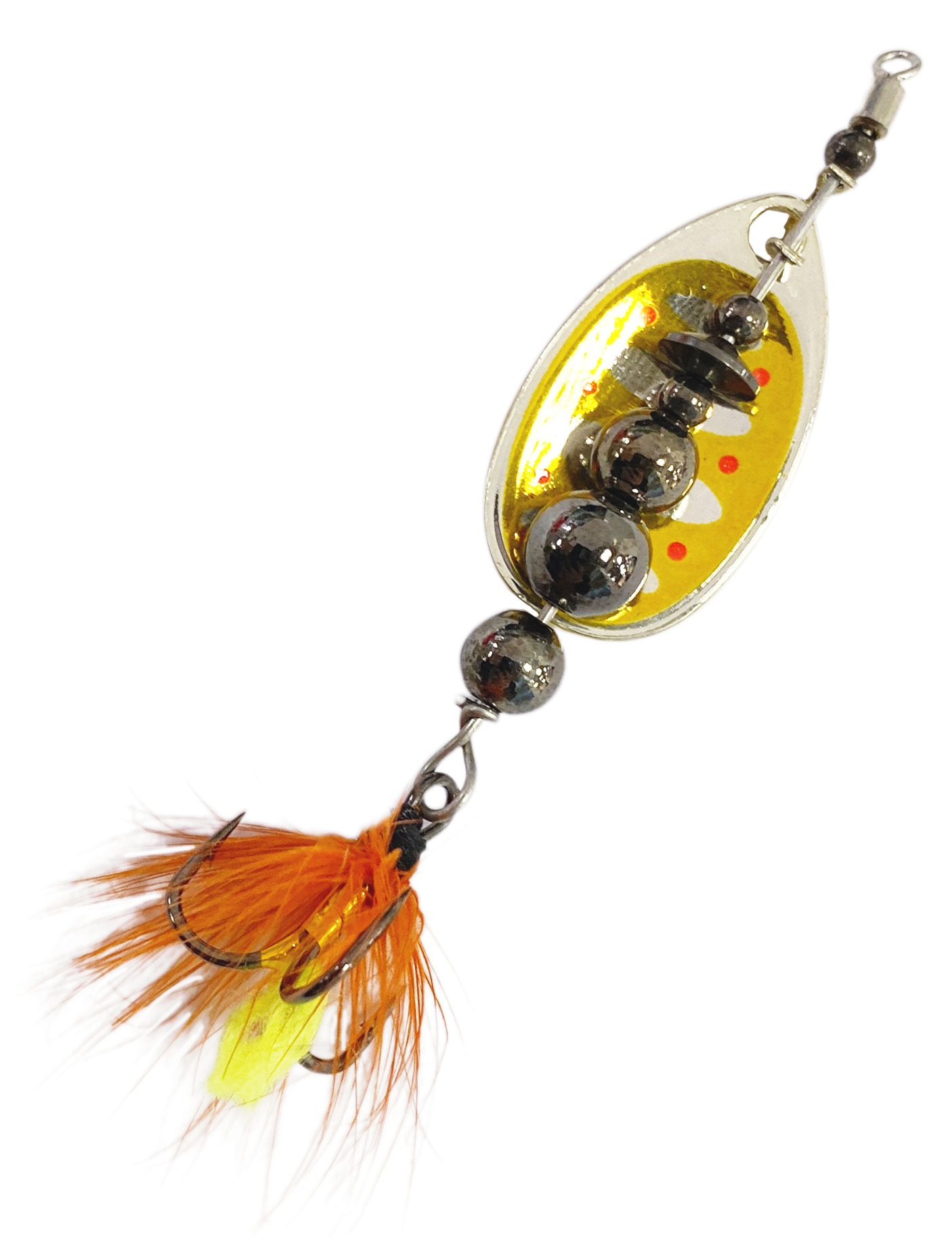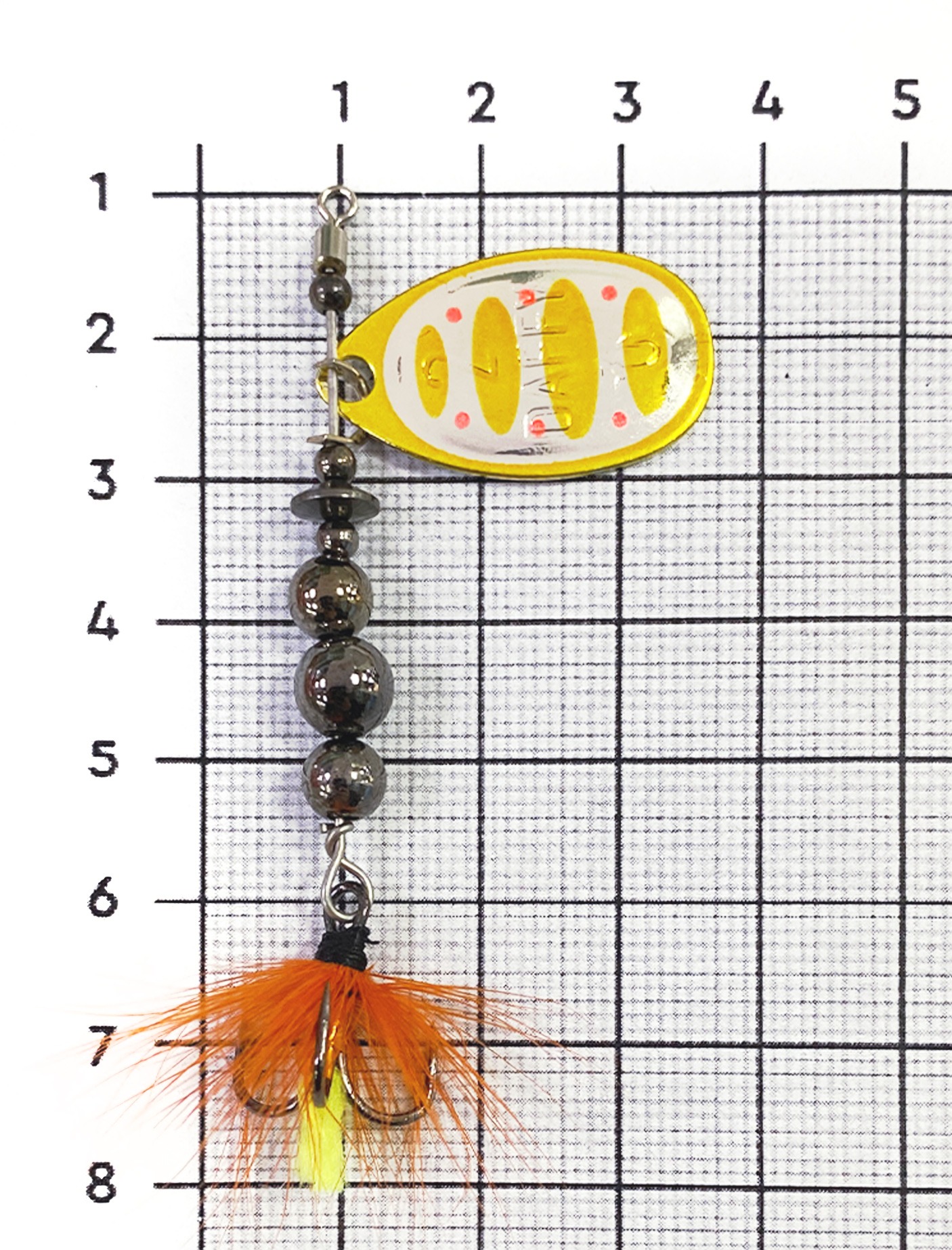 Приманка оснащена тройниками с мушкой. Это позволяет решить сразу несколько задач: выполняется маскировка тройника, осуществляется стабилизация задней части блесны при проводке и, самое главное, мушка служит дополнительной изюминкой для привлечения хищника.