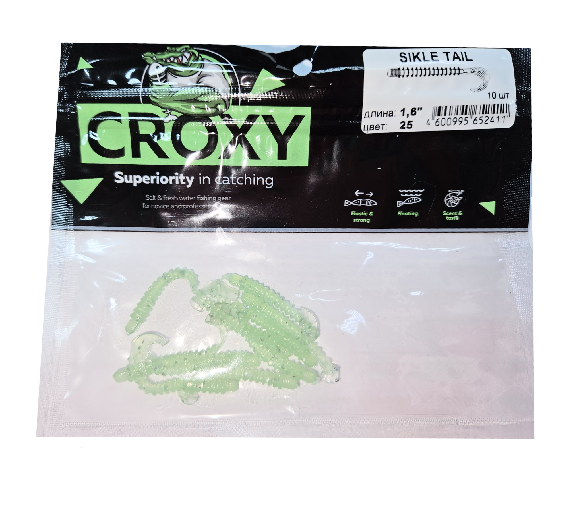 Croxy Sikle Tail 1,6" - хороший вариант для микроджиговой рыбалки. За активную игру отвечает серповидный плоский хвостик, который "оживает" при малейшем движении удилища. Выступы на теле создают дополнительные гидроакустические вибрации при проводке. Твистер можно использовать на окуневой и форелевой рыбалке, при ловле красноперки и других рыб.