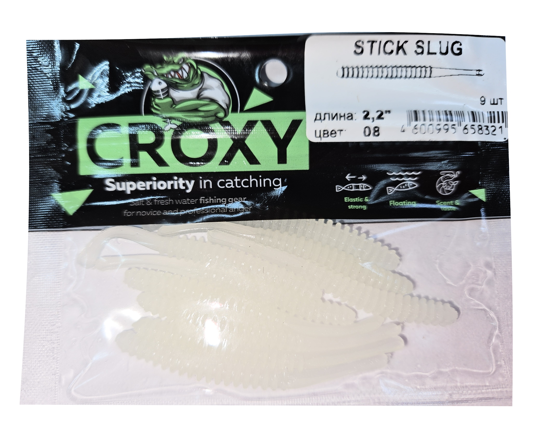 Croxy Stick Slug 2,2" – объемный слаг при активной анимации обладает индивидуальной игрой, при которой "ребра" на теле приманки, а также тонкий хвостик интенсивно двигаются, создавая колебания в водном потоке. Они служат для хищника сигналом и привлекают его с большого расстояния, а также способствуют более быстрому распространению аттрактанта.