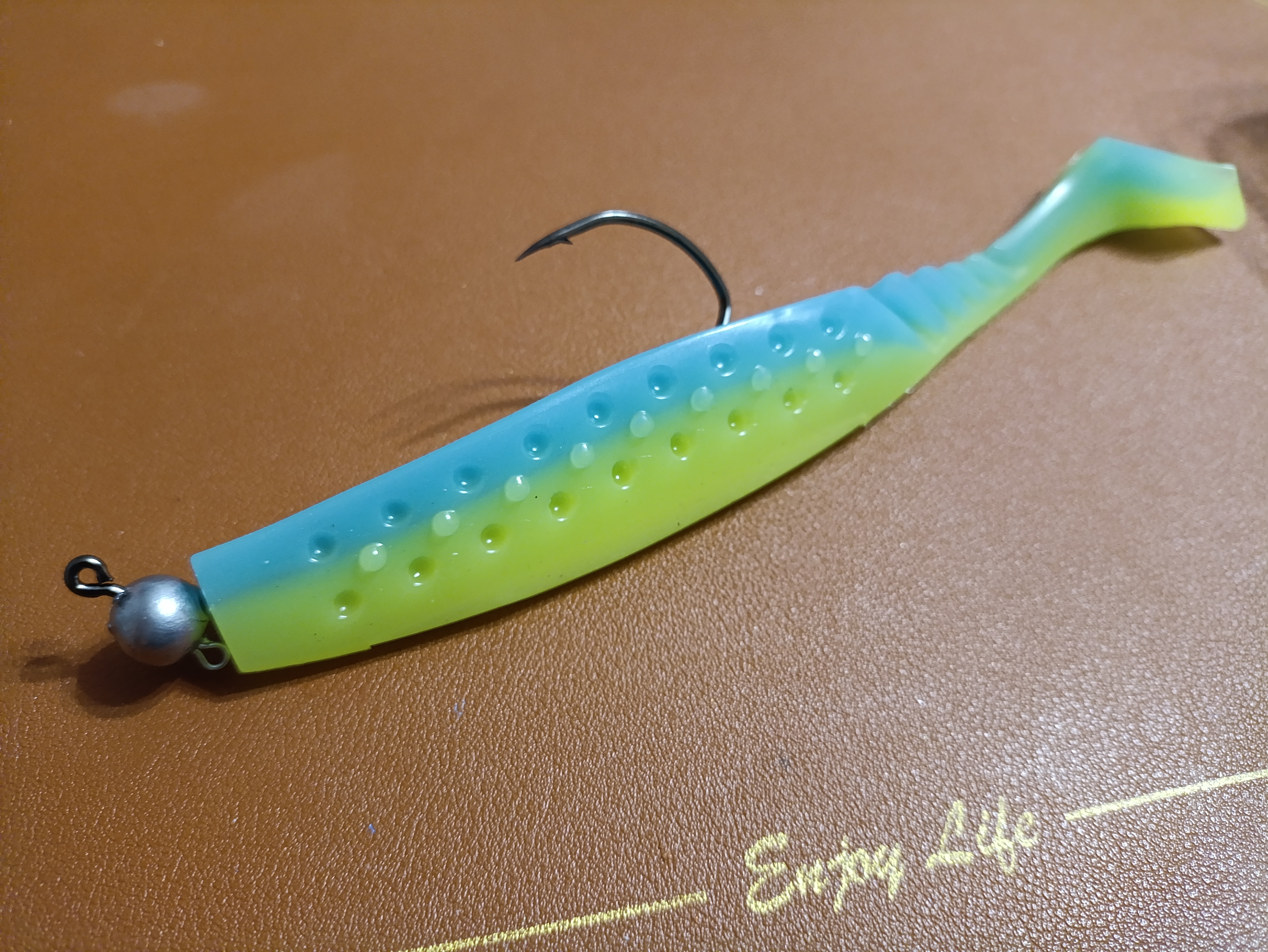 Ребристость обеспечивает более мягкое и подвижное движение хвоста, сохраняя при этом внешний объем приманки. "Пятки" легко играются даже при минимальной скорости. Специальные пазы-прорези для офсетных крючков на верхней и нижней сторонах приманки облегчают ее оснащение.