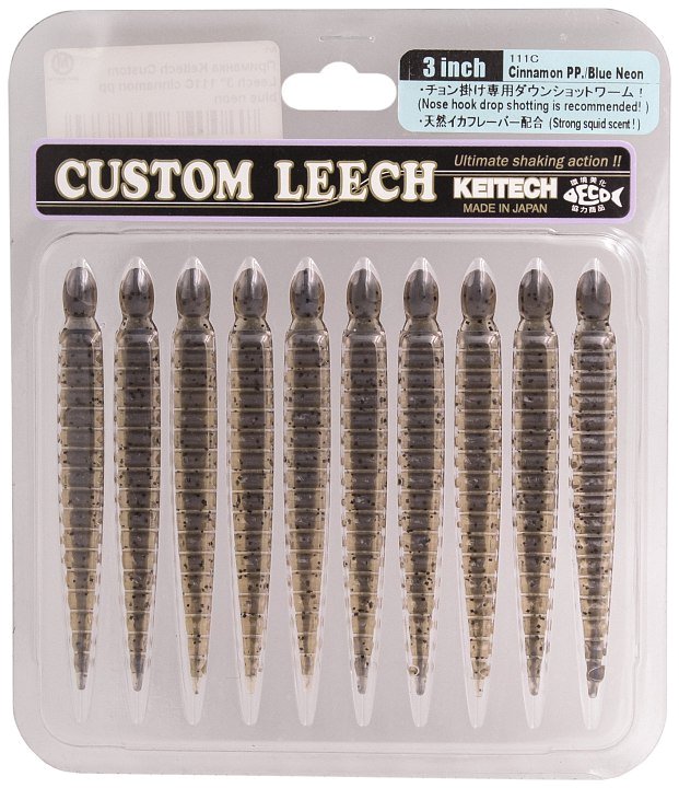 Keitech Custom Leech — необычная силиконовая приманка, весьма реалистично имитирующая пиявку. Приманка имеет длинное плоское сегментированное тело, состоящее из горизонтально ориентированных валиков. В средней части приманки тело более широкое, ближе к хвосту оно сужается. Благодаря такому строению Custom Leech обладает большой подвижностью, но собственной активной игры не имеет. Поэтому анимировать ее нужно с помощью удилища. Также на теле пиявки имеется небольшой хвостик и голова, за которую удобно цеплять крючок.