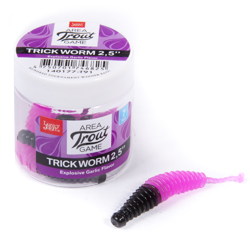 Компания Lucky John разработала новую программу для любителей ловли прудовой форели. Серия приманок Trick Worm входит в линейку специализированных форелевых приманок. Кроме рыбалки на пресноводных прудах, эта модель может использоваться для рокфишинговой ловли. Объемная приманка с ребристым телом хорошо подходит для оснасток “дроп шот”, “джиг риг”, каролинских и техасских монтажей Она представлена в ярких окрасках, традиционно используемых для форелевой рыбалки. Приманки Trick Worm - “съедобные”. Они обработаны большим количеством маслянистого аттрактанта с насыщенным запахом чеснока. Приманки упакованы в пластиковые баночки с герметичной крышкой, которые лучше сохраняют аромат аттрактантов.
