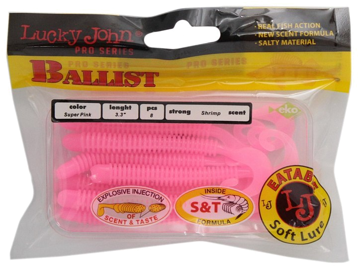 Съедобная резина Lucky John Ballist сочетает в своей форме червя и твистер. Данная приманка с запахом креветки имеет ребристое вытянутое тело и мягкий небольшой твистерный хвостик. В воде при проводке похожа на пиявку или крупную личинку. Имеет широкую гамму расцветок, среди которых есть и реалистичные, и кислотные цвета. Ballist является идеальным вариантом для разнесенных оснасток. Подходит для разнообразных проводок от равномерной медленной до похожей на твитчинг с небольшими резкими рывками. Эта резина очень результативна в микроджиге как при ступенчатой обычной проводке, так и при волочении приманки по дну.