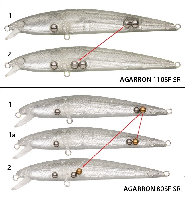 По своей сути Agarron – медленно всплывающий (slow- FloatingFloating - при забросе останавливаются на малой глубине, однако при малейшем движении катушки всплывают и двигаются в верхнем слое воды.Подробнее ) воблер, что и отражено в его аббревиатуре. Во время паузы при проводке он не просто всплывает, а еще и вибрирует. Именно это свойство и обеспечивает ему звуко-балансировочная система Koto Koto Balanced SystemKoto Koto Balanced System Koto Koto Balanced System - система балансировки воблера на основе полуподвижного вольфрамового грузика. Такие воблеры летят дальше, и не запутываются в шнуре при забросе.Подробнее .