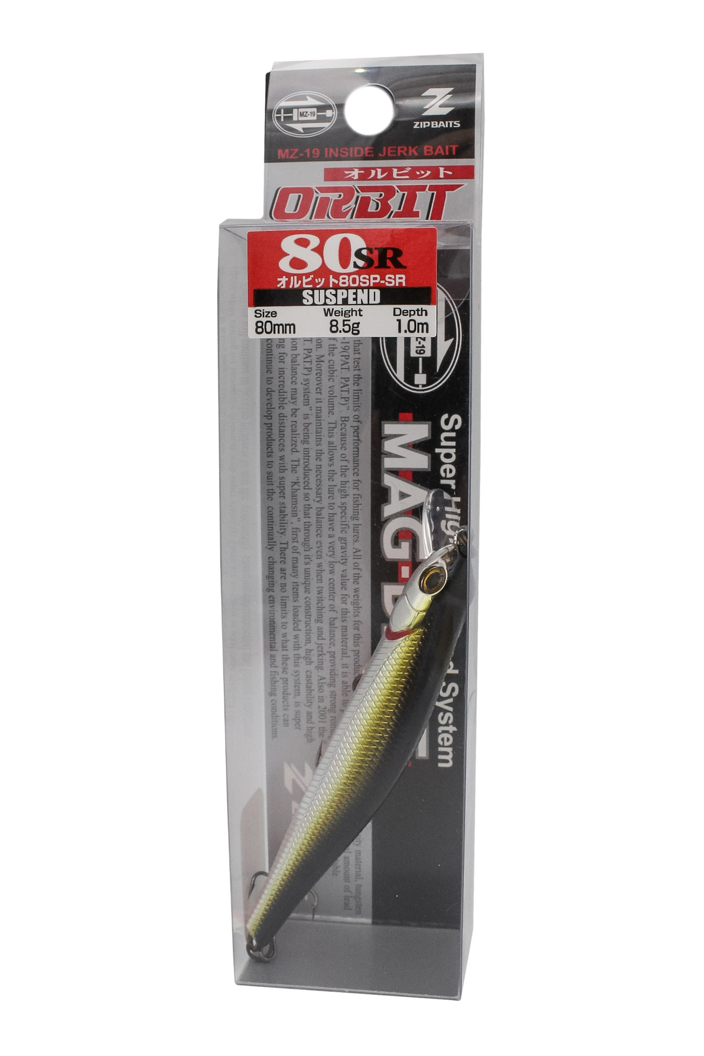 Помимо вольфрамового груза MZ-19MZ-19 - способствует не только правильной балансировке приманки при проводке, но и далекому точному забросу.Подробнее в головной части воблеров стационарно вмонтирован еще один утяжелитель в виде латунного цилиндрика. Именно за счет незначительного смещения центра тяжести в головную часть игра приманки приобретает характерные только для Orbit-ов черты, при неравномерной проводке в фазе твича воблер аппетитно клюет носом, всем своим видом напоминая кормящегося малька.