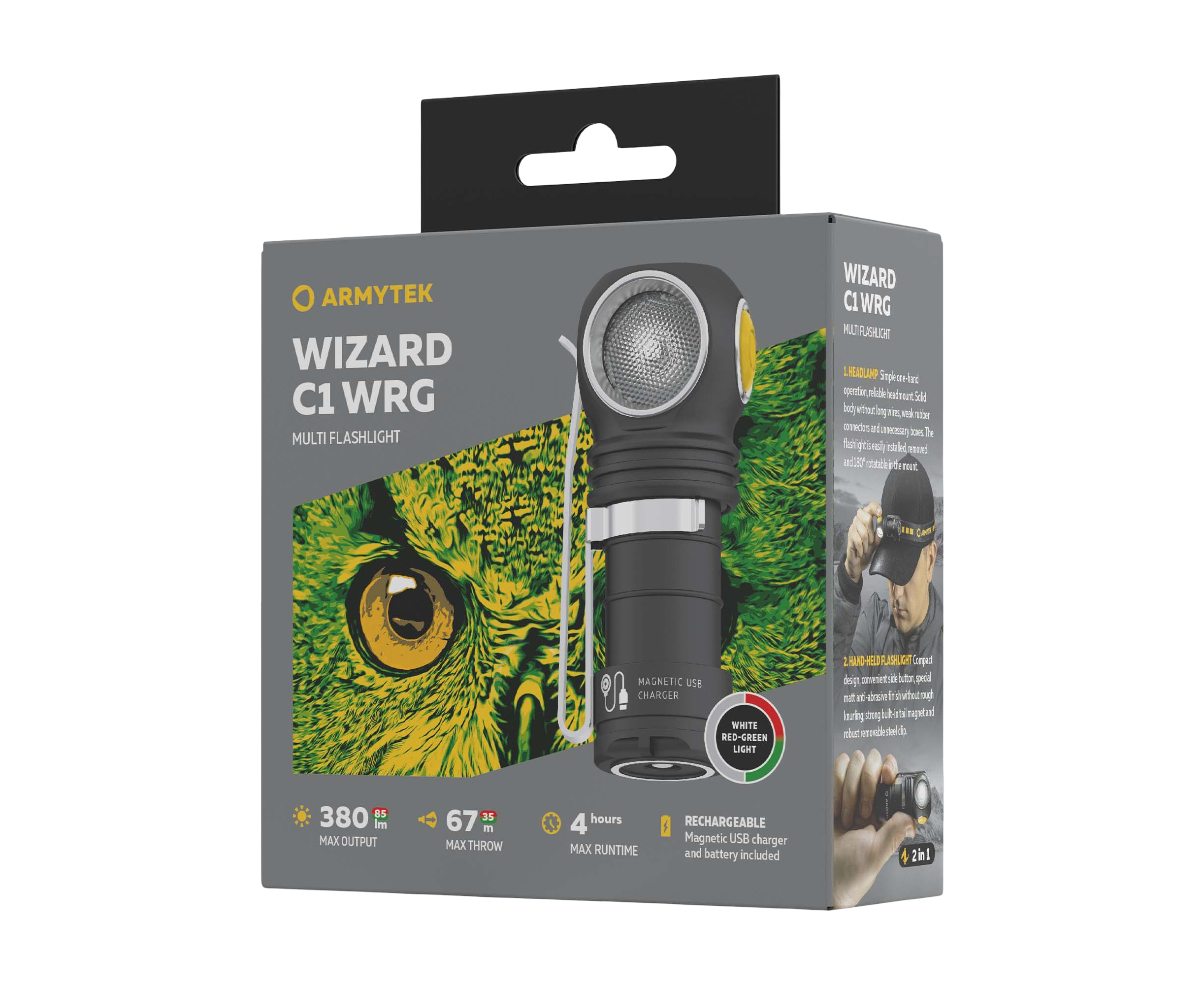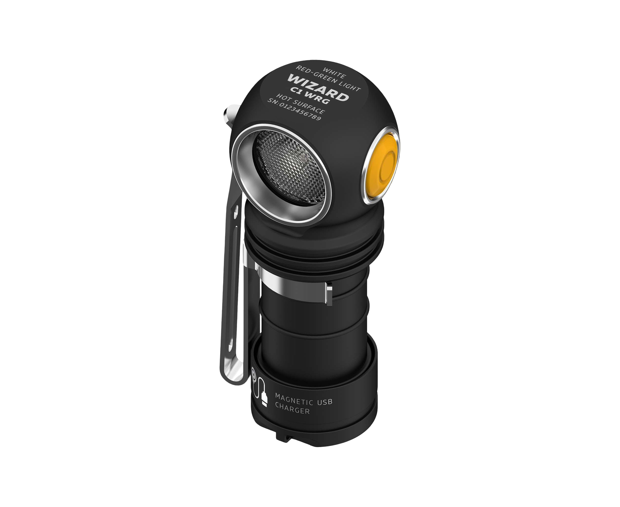 Wizard C1 WRG имеет несколько вариантов фиксации: в налобном креплении, на одежде, ремне или сумке с использованием клипсы, на металлических поверхностях с помощью мощного магнита в задней крышке. В задней крышке фонаря также есть отверстие под ремешок или стальное кольцо. Модель совместима с опциональным универсальным креплением ABM-01 и с креплениями на каску серии AHM.