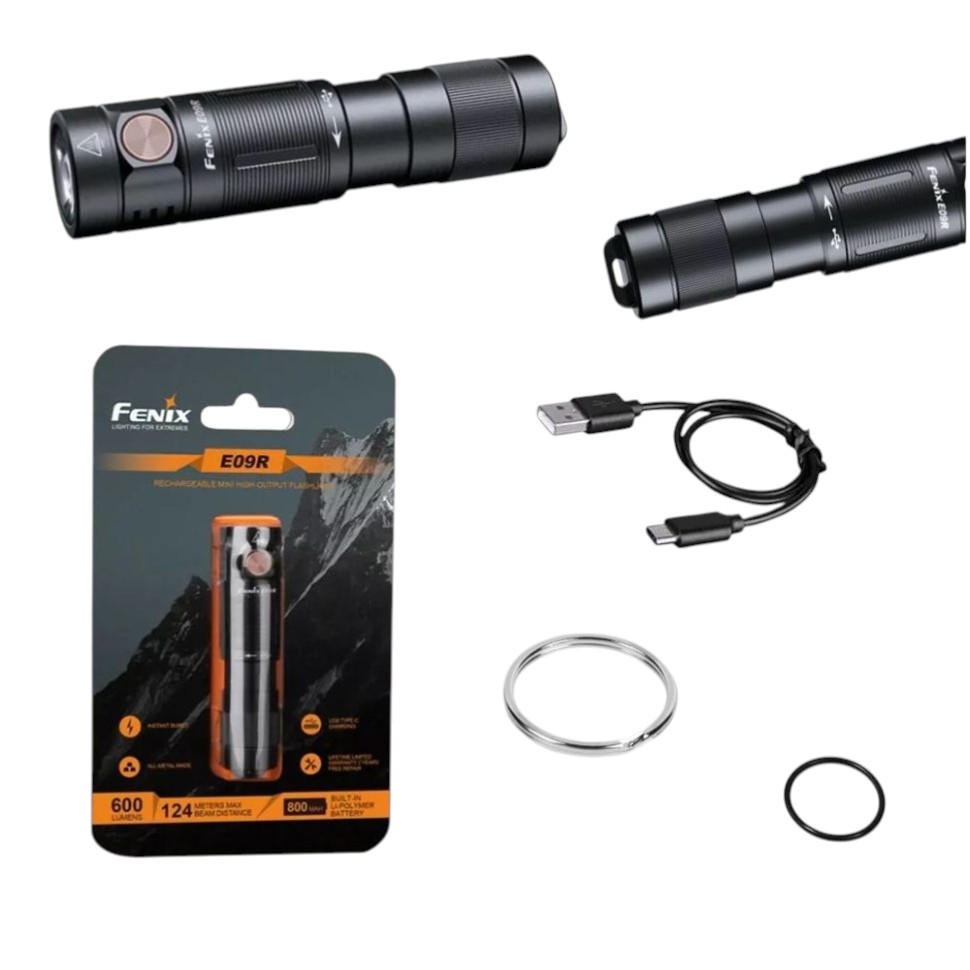 Компактные размеры (79 мм в длину и 19,3 мм в ширину) и вес всего 45 г делают Fenix E09R удобным для ношения на связке ключей или в кармане. В комплекте поставляется кольцо для крепления на ключи, кабель USB Type-C для зарядки и запасное уплотнительное кольцо.