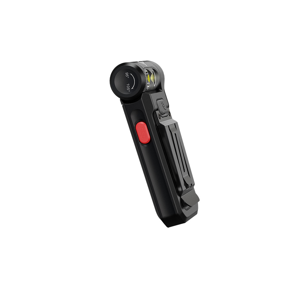 Головная часть фонаря может изменять угол наклона в пределах 200°, позволяя поворачивать её вперёд на 105° и назад на 95°. Это расширяет возможности использования и помогает точнее направлять световой поток. Управление белым и красным светом осуществляется раздельными кнопками, расположенными на передней и боковой стороне корпуса, что обеспечивает удобство и мгновенную смену режимов.